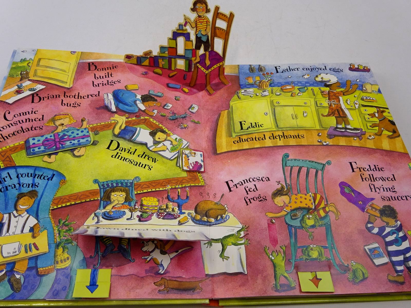 Slightly better than very good condition. A lift-the-flap, pull-the-tab, turn-the-wheel, pop-up alphabet book! Large format. Glazed pictorial boards.