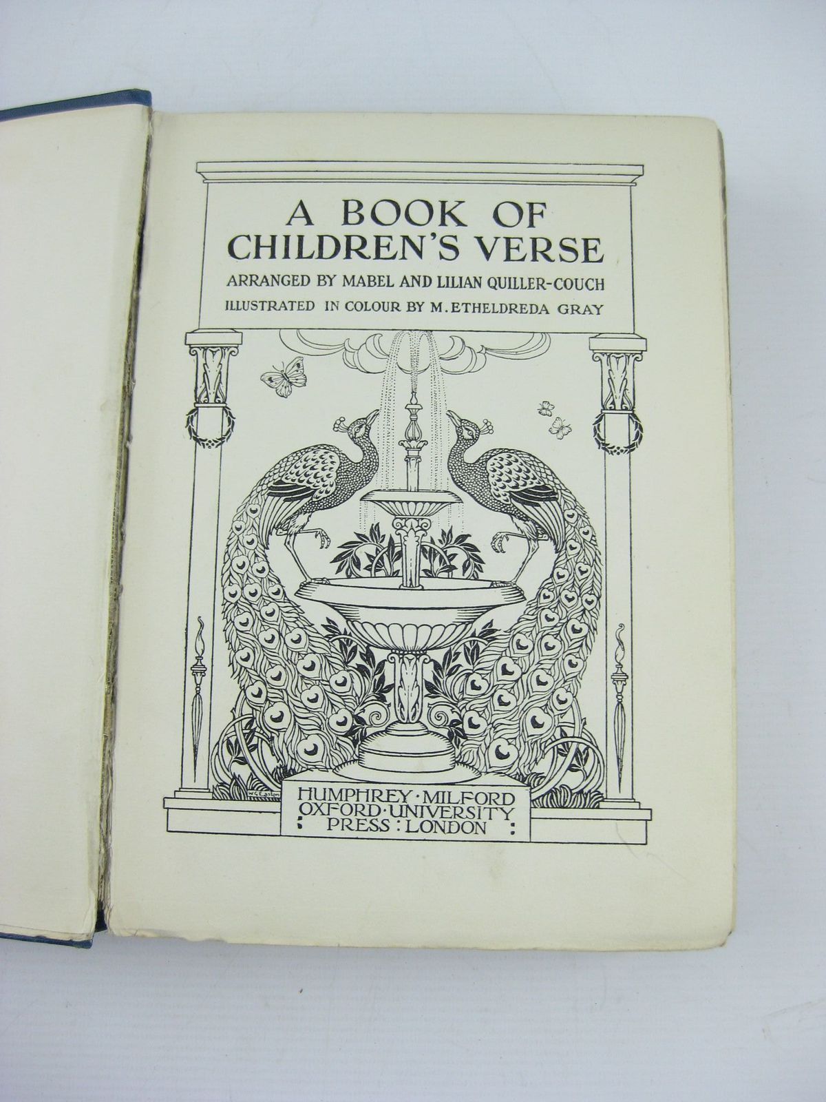 Good condition. Blue cloth with elaborate gilt decorations and titles. 20 beautiful colour plates mounted on grey card with captions below. Verses arranged by Mabel and Lilian Quiller-Couch.
