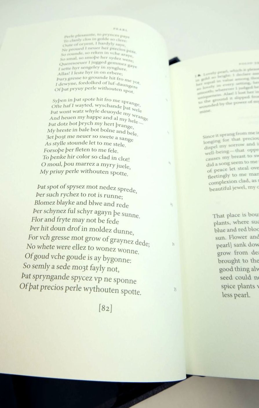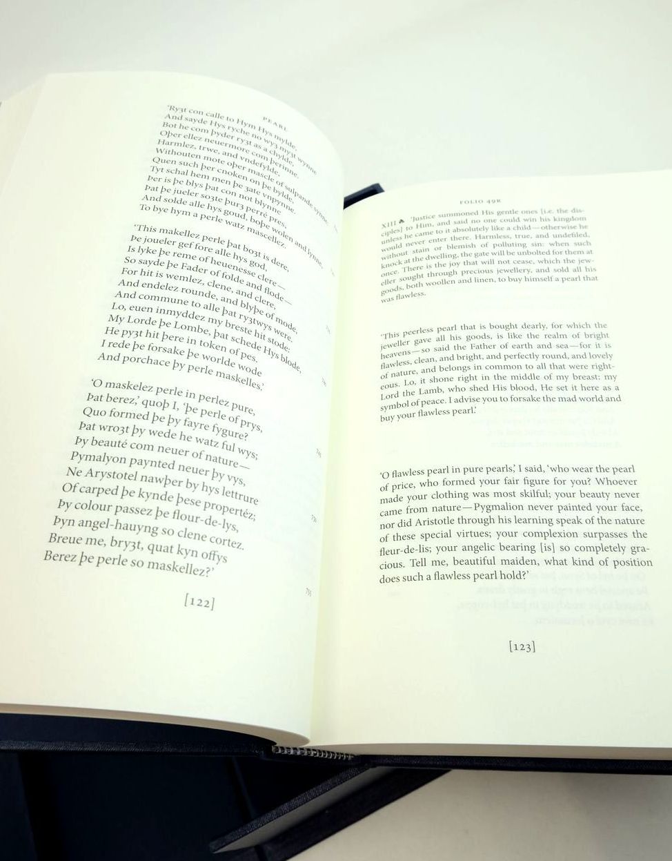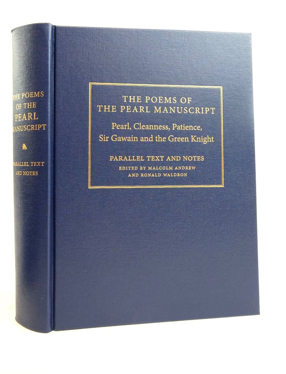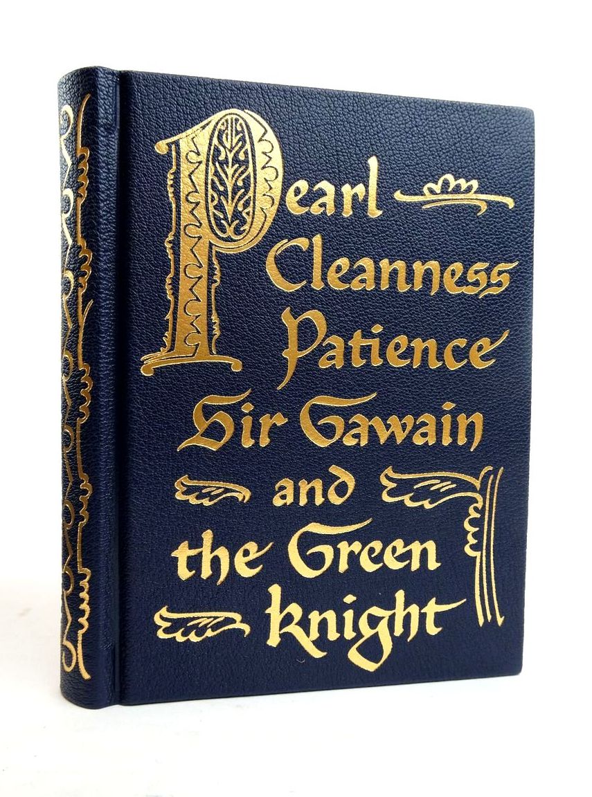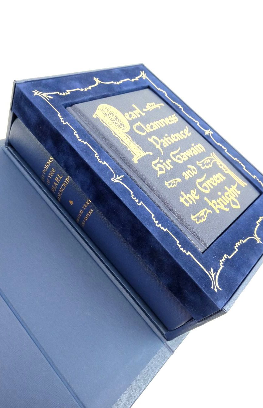 Fine condition. Pearl, Cleanness, Patience, Sir Gawain and the Green Knight. An exquisite facsimile of The Pearl Manuscript (an illuminated manuscript). Bound in blue leather with gilt title to front and gilt tolling to spine. Blue ribbon page marker. Also contains a commentary of parallel text and notes edited by Malcolm Andrew and Ronald Waldron. All contained in publisher's solander box. Limited Edition of 980.