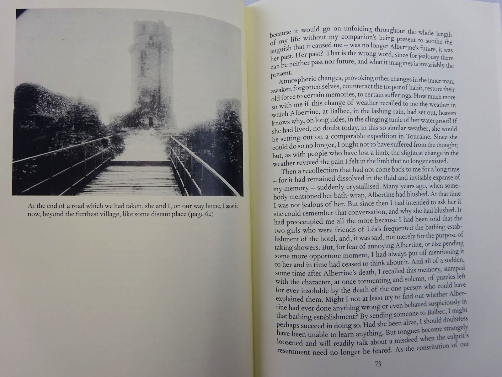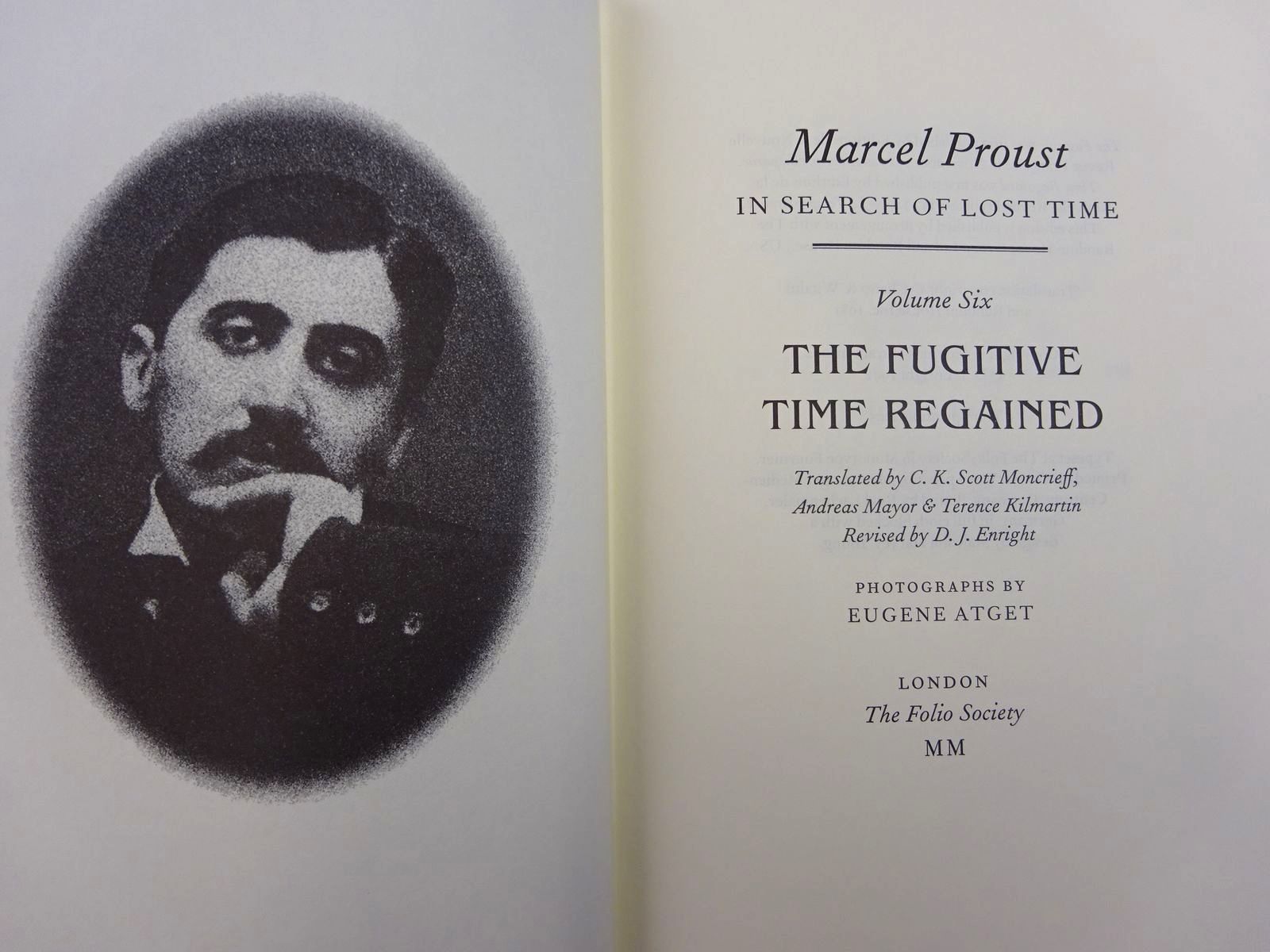 Nearly fine condition. Light and dark blue cloths, with gilt and blue titles. Titles are: 1: Swann's Way; 2: Within A Budding Grove; 3: The Guermantes Way; 4: Sodom and Gomorrah; 5: The Captive; 6: The Fugitive Time Regained. Translated by Moncrieff, Kilmartin. Revised by Enright. Introduced by Jean-Yves Tadie. Complete set in two slipcases. Photographs by Eugene Atget.