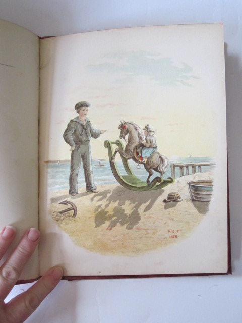 Spine and corners bumped and worn. Covers damp stained, causing stains to endpapers and last couple of pages. Contents appear to have been neatly restitched. Endpapers are lightly browned and there is foxing throughout. Transfer stickers have been stuck down onto copyright page and to top margin of first page. Some grubby finger marks but generally contents are clean. A decent copy of this Victorian children's book.