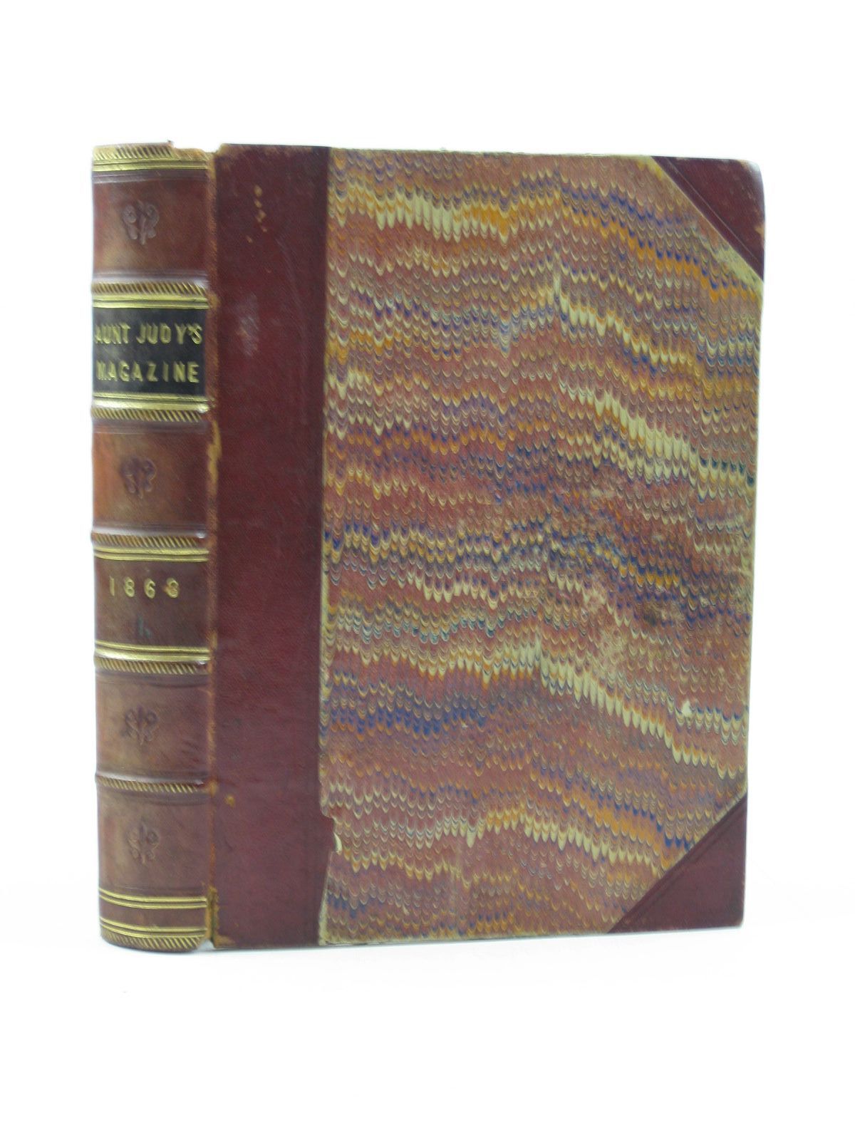 For young people edited by Mrs Gatty. Red three quarter leather binding with marbled boards and text block. Raised bands to spine with gilt lines and titles. Black title block. Contains November 1868 to April 1869. B/w illustrations. 380 pages. Spine worn with chip from top and bottom edge. Bumping to corners. Wear to corners, cover edges and some of leather. Slight loss from edge of marbling on front cover. Slight scuffing to marbling. Marks to pastedowns, appear to correspond with leather. Pencil writing about contents to title page. A few marks/fingermarks to prelims, contents generally clean.