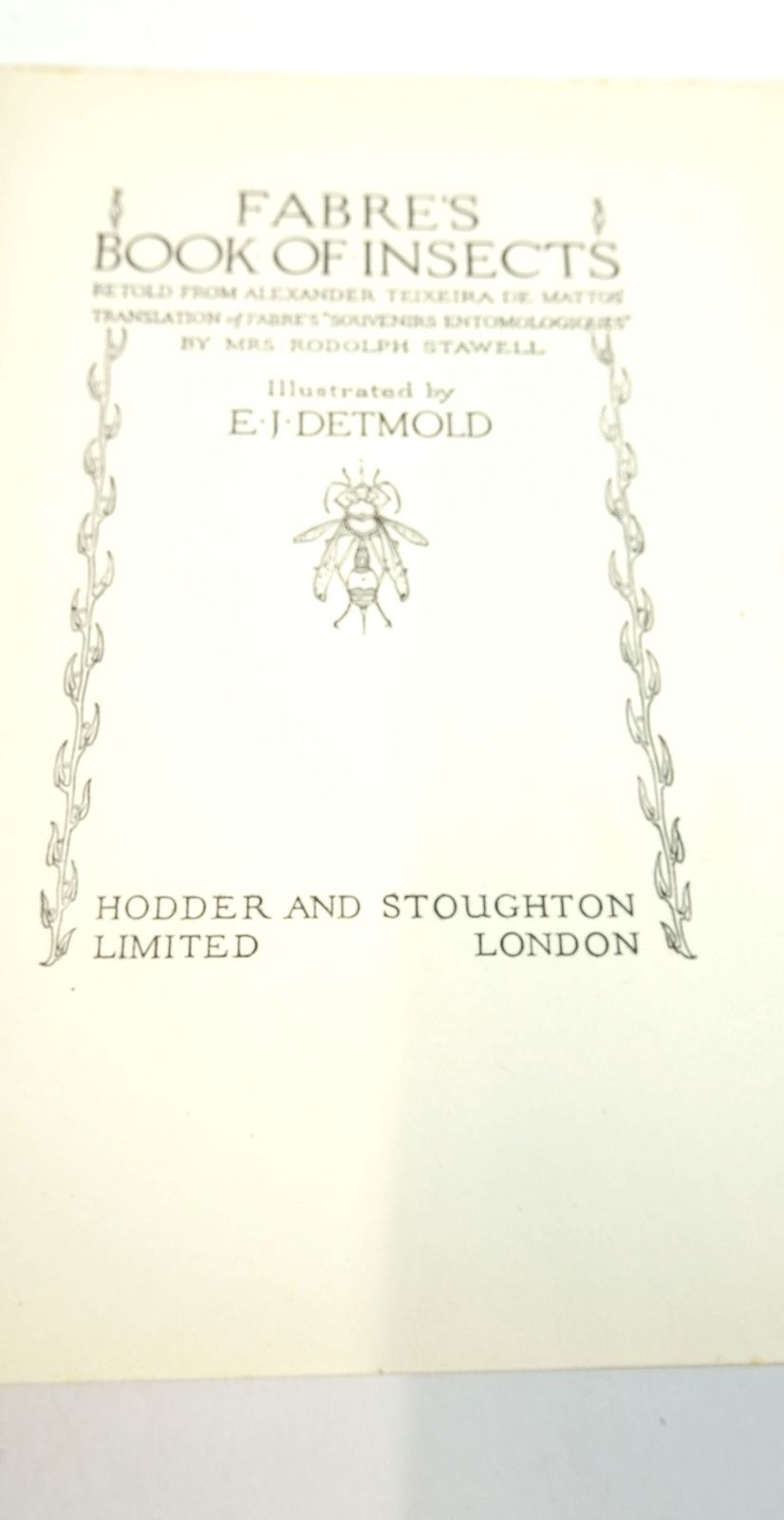 Very good condition. Retold from Alexander Teixeira de Mattos' Translation of Fabre's "Souvenirs Entomologiques" by Mrs. R.Stawell. Cream cloth boards, gilt titles and decorations. Embossed vignette of dragonfly to rear board. 12 colour plates. vii and 184 pages.