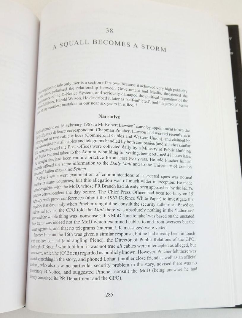 Nearly fine condition in a slightly better than very good dustwrapper. The development of the D-Notice system, which regulates the UK media's publication of British national security secrets. Black cloth boards, silver titles.