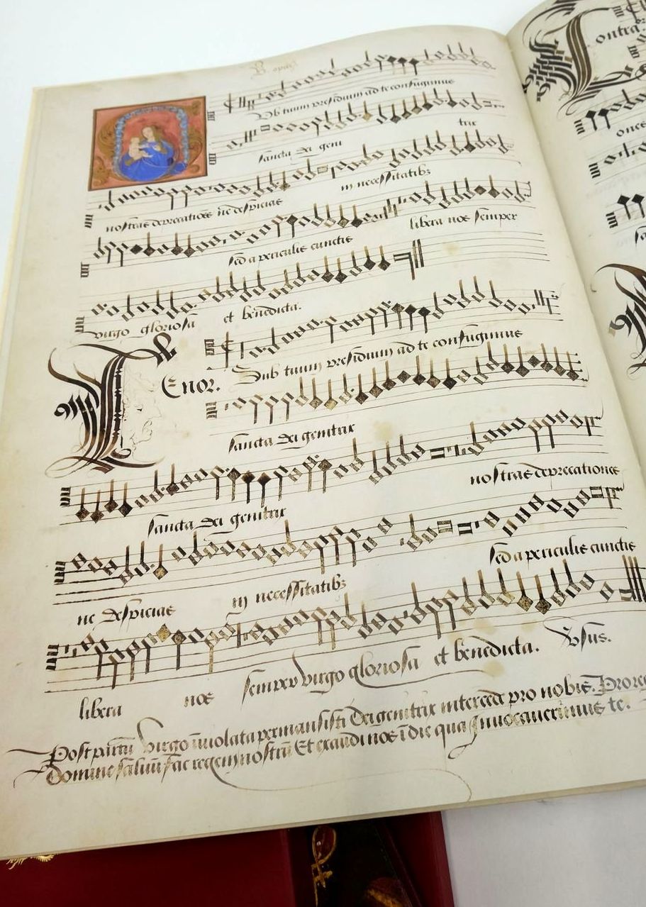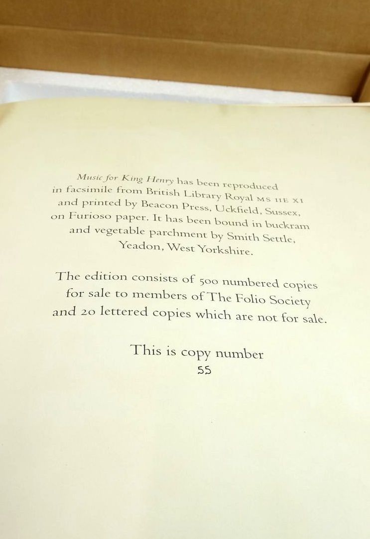 Slightly better than very good condition. A facsimile of a Royal Choirbook. Very large format. Burgundy cloth spine, cream boards with gilt & foil decorations. Limited edition of 500 copies and 20 lettered copies. 36 pages. Coloured frontispiece and ornamented initial letters. Also includes a commentary volumes which has red cloth spine with gilt title and pictorial front board. Colour illustrations and 117 pages. Also included is a CD: Henry's Music Motets from a Royal Choirbook Songs by Henry VIII.