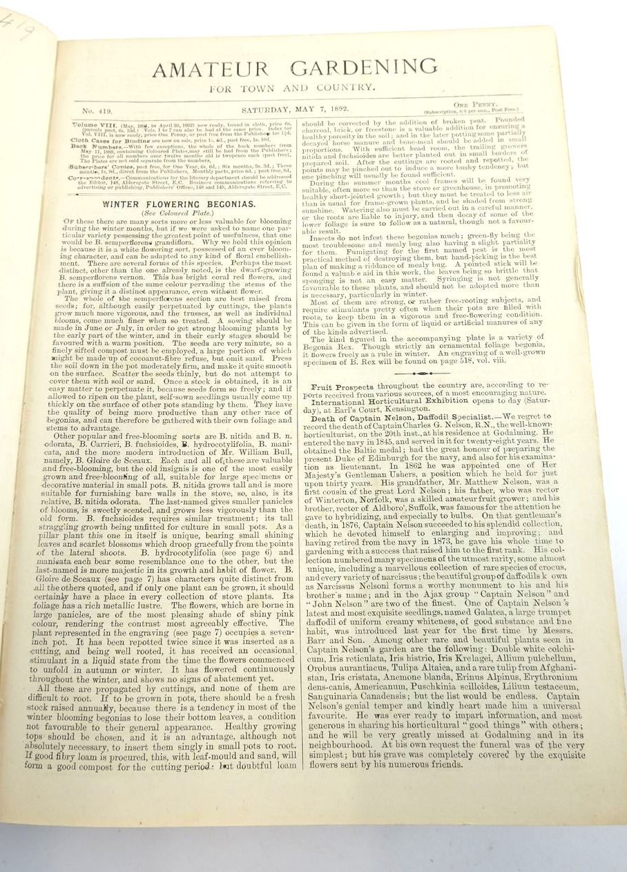 Almost very good condition. May 1892 - April 1894 of weekly Amateur Gardening magazine in a bound volume. Large, heavy format. Each magazine begins with a colour plate depicting different flowers. Some b/w illustrations and sketches.
