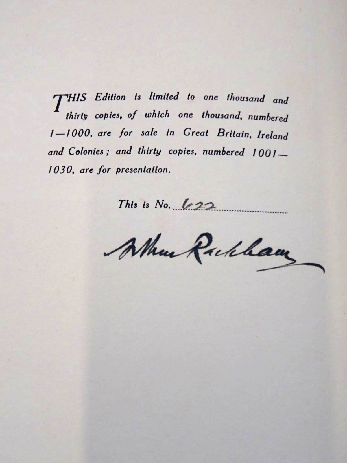 Very good condition. A personalised collection of 44 colour plates of Rackham's past work brought together in one sumptuous volume with introduction by Arthur Quiller-Couch. This is the Deluxe Limited edition of 1030 copies. Gold pictorial white cloth with gold lettering to cover and spine. Top edge gilt. All others untrimmed. Plates mounted on stiff brown paper. 10 b/w drawings plus a sketch of a bookplate on front paste-down.