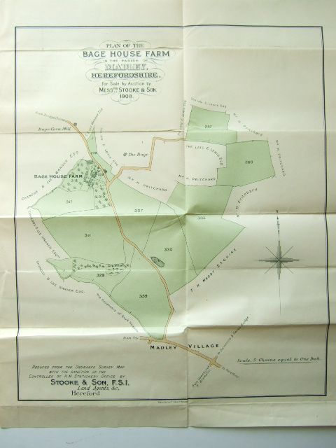 Very good condition. Large format. 14 x 9 inches. White printed paperwraps. Large folding colour map. Sale particulars for Bage House Farm to be sold on Wednesday the 1st day of July 1908.