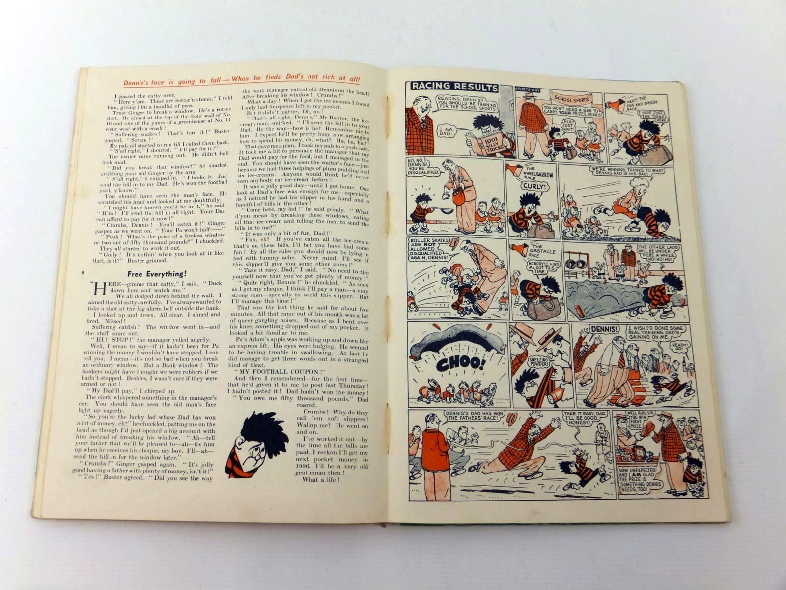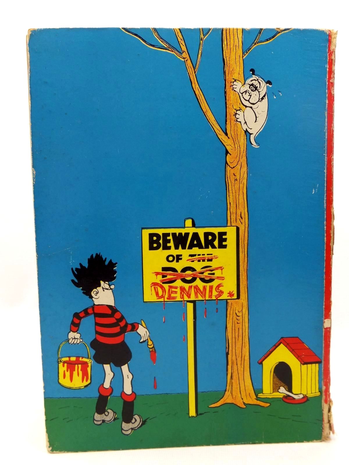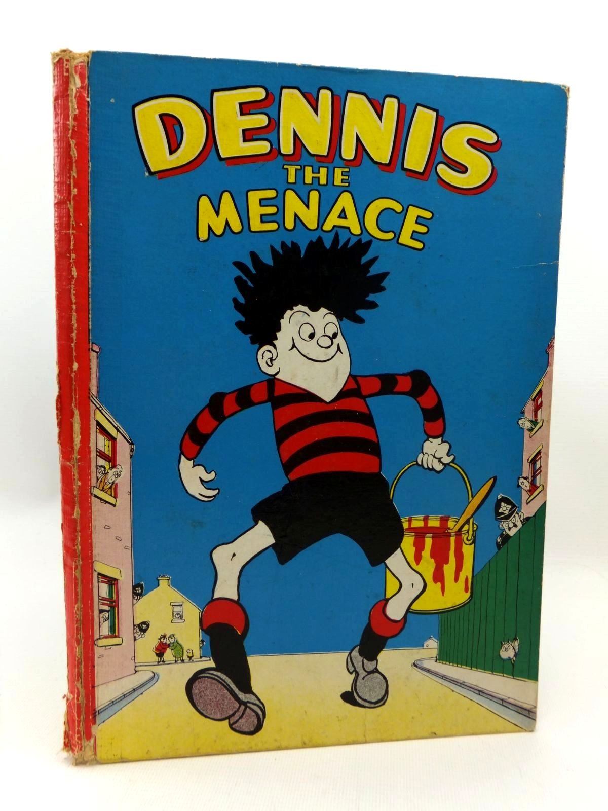 Almost very good condition. Large format. Pictorial boards. Red spine. Front cover shows Dennis striding down the street with a tin of red paint in his hand. First story is 'Soap and Soot'. The First Dennis the Menace annual.
