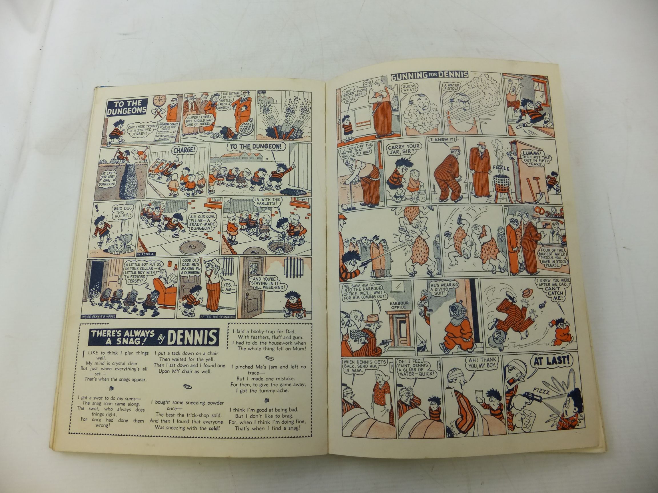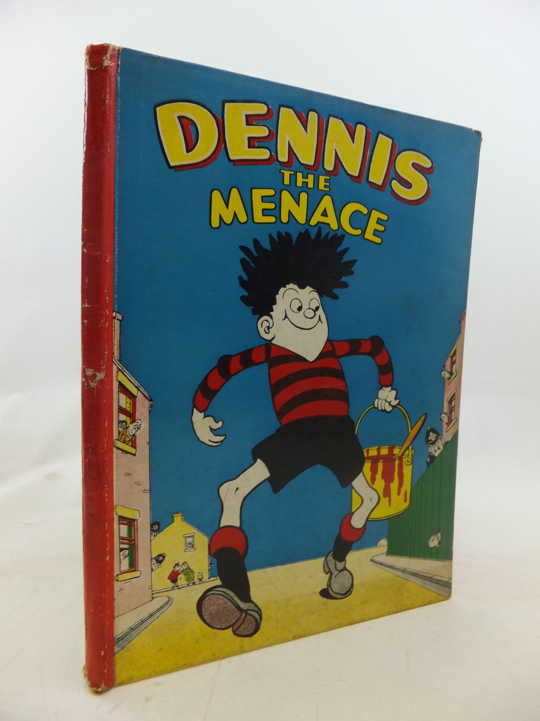 Very good condition. Large format. Pictorial boards. Red spine. Front cover shows Dennis striding down the street with a tin of red paint in his hand. First story is 'Soap and Soot'. The First Dennis the Menace annual.