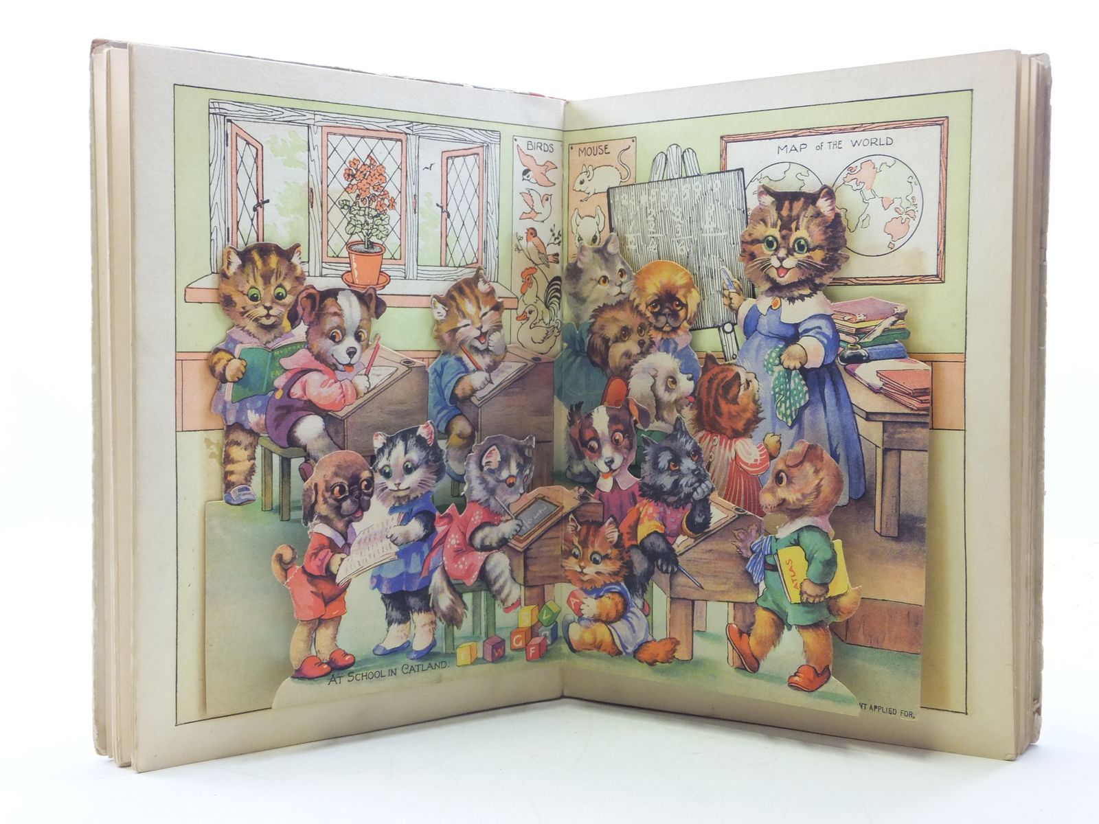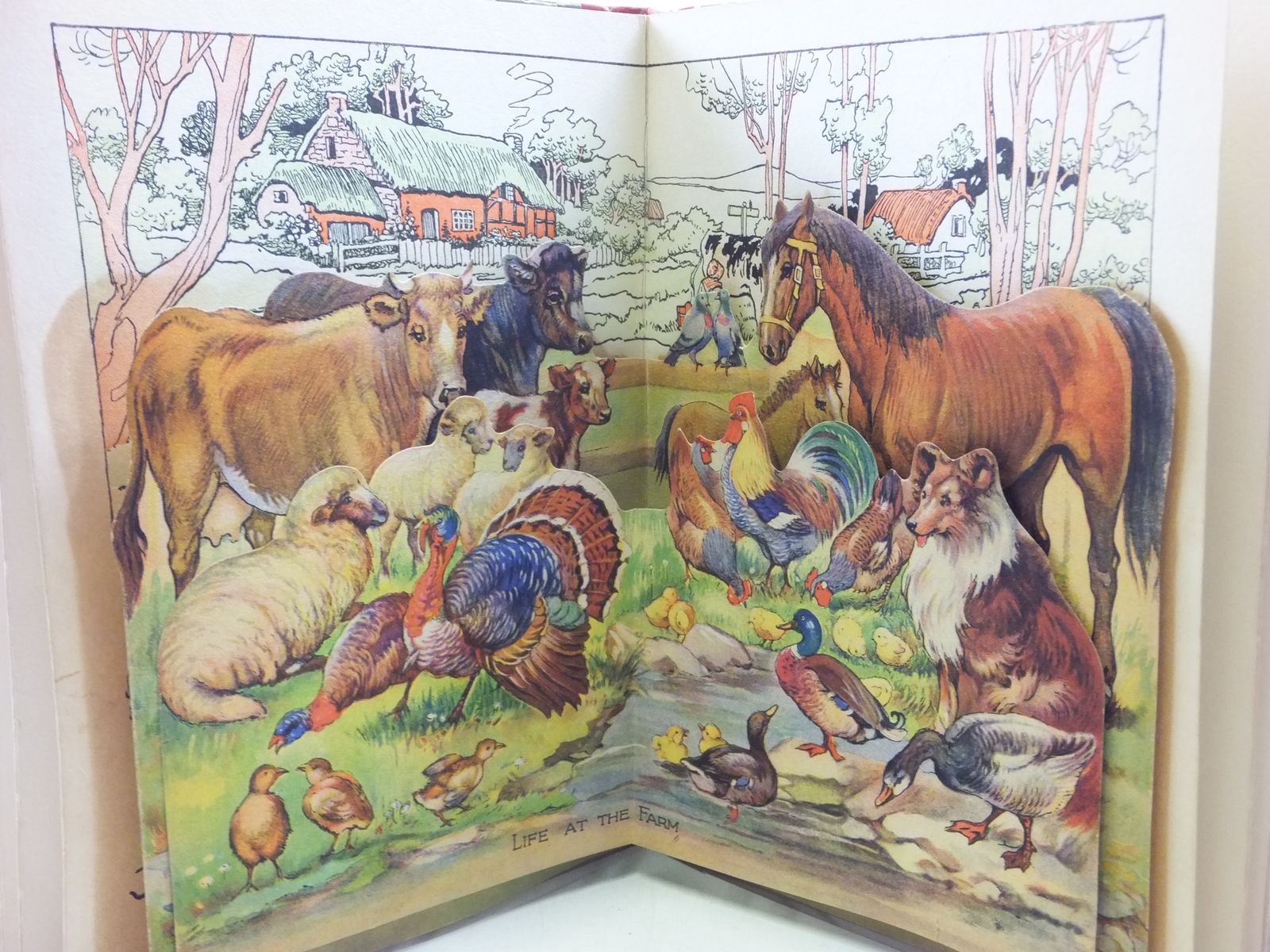 Good condition. Red cloth spine. Front cover shows girl giving smaller child a piggy-back ride in the snow. 2 pop-up scenes: A School in Catland and Life At The Farm. Numerous two-tone and b/w pictures.