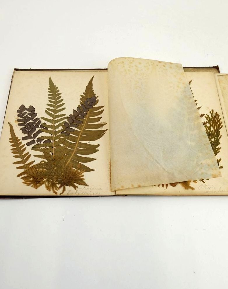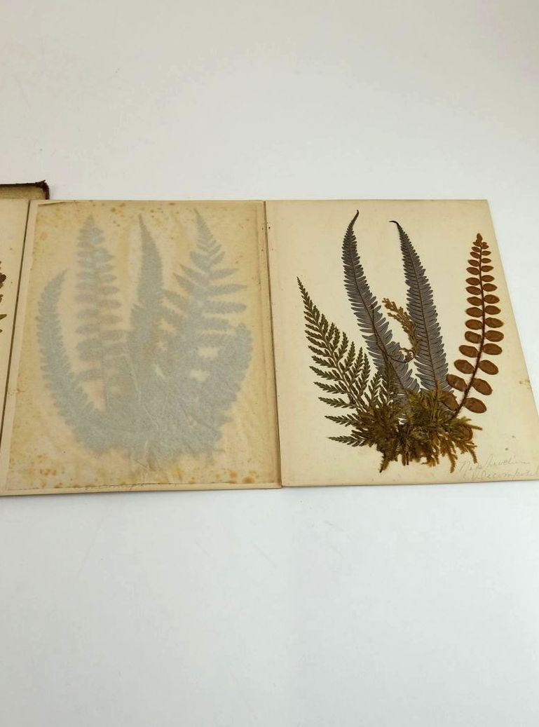 Spine has disintegrated with much loss. Corners are worn. Foxing to tissue guards and pale foxing to specimen pages. Pressed specimens are discoloured with age but complete. Ribbon closure to vertical edge of boards is missing. An unusual item.