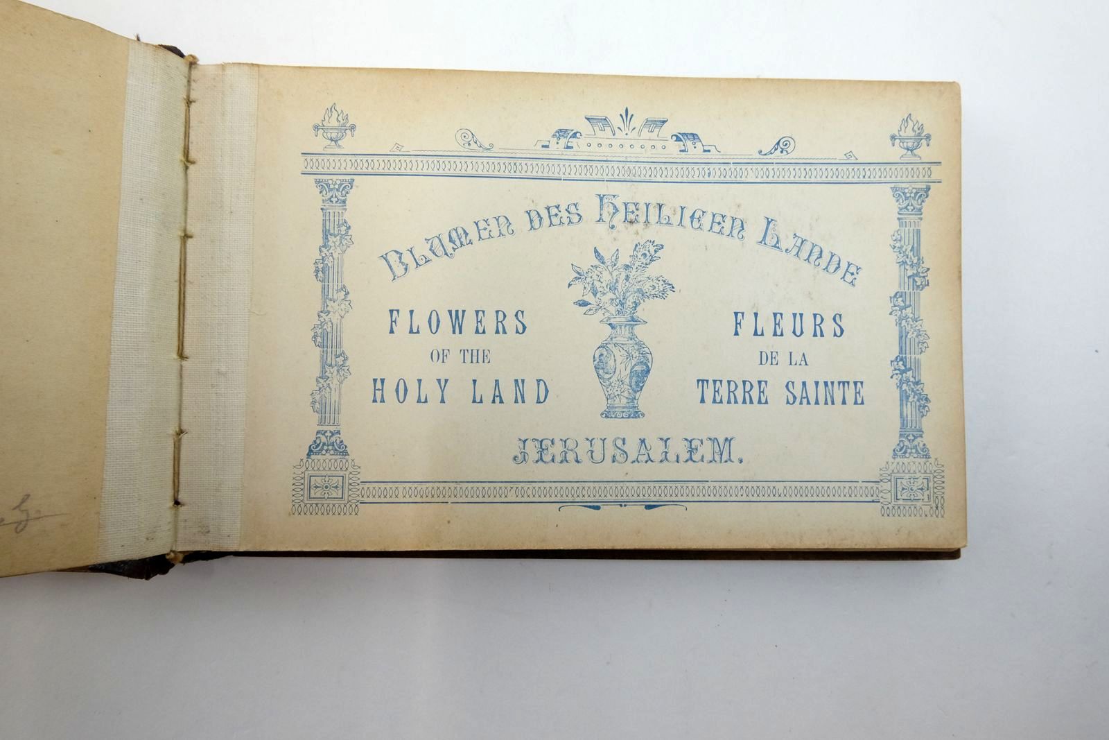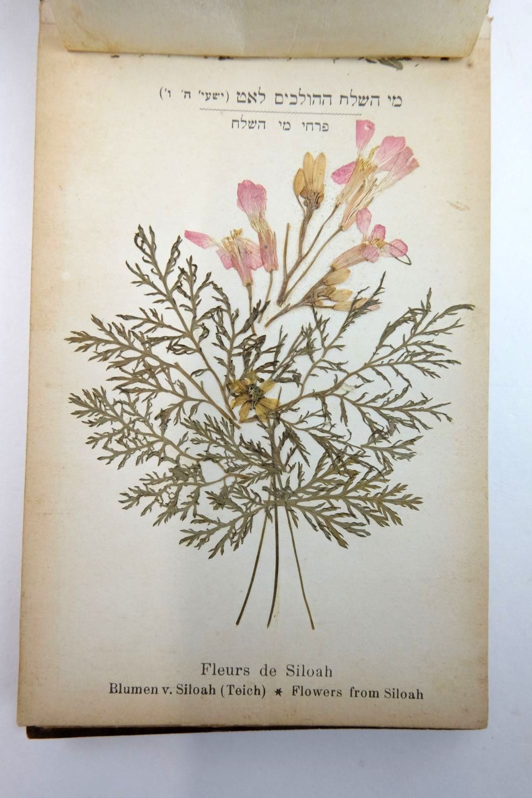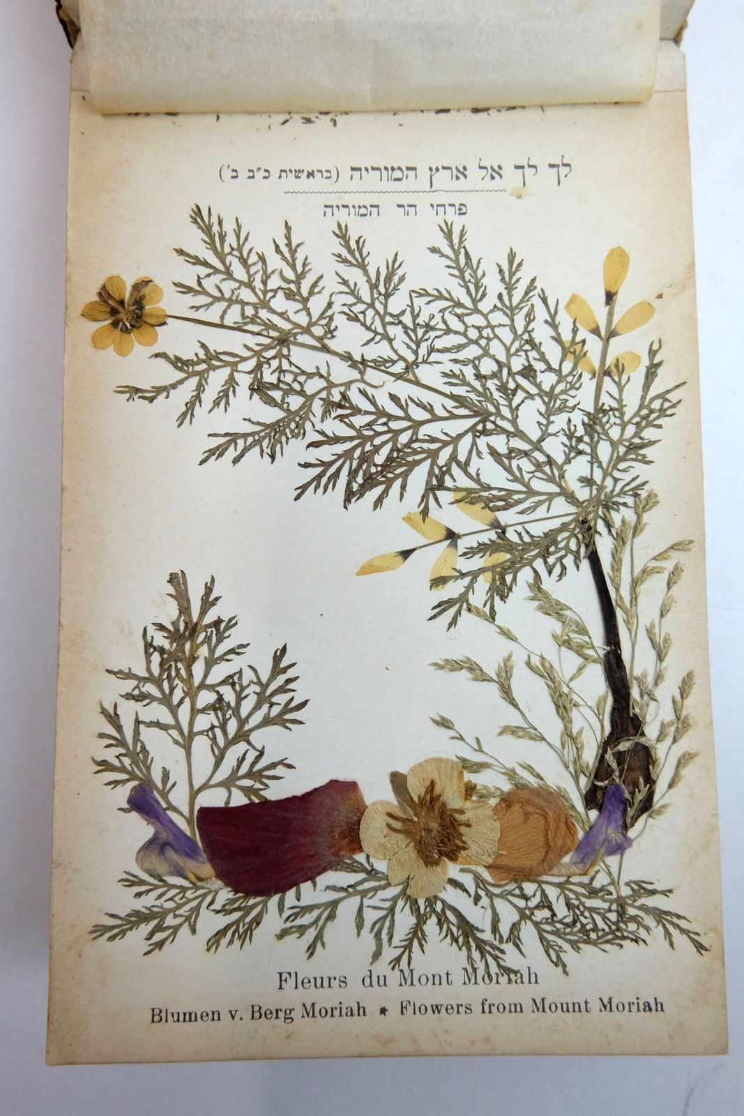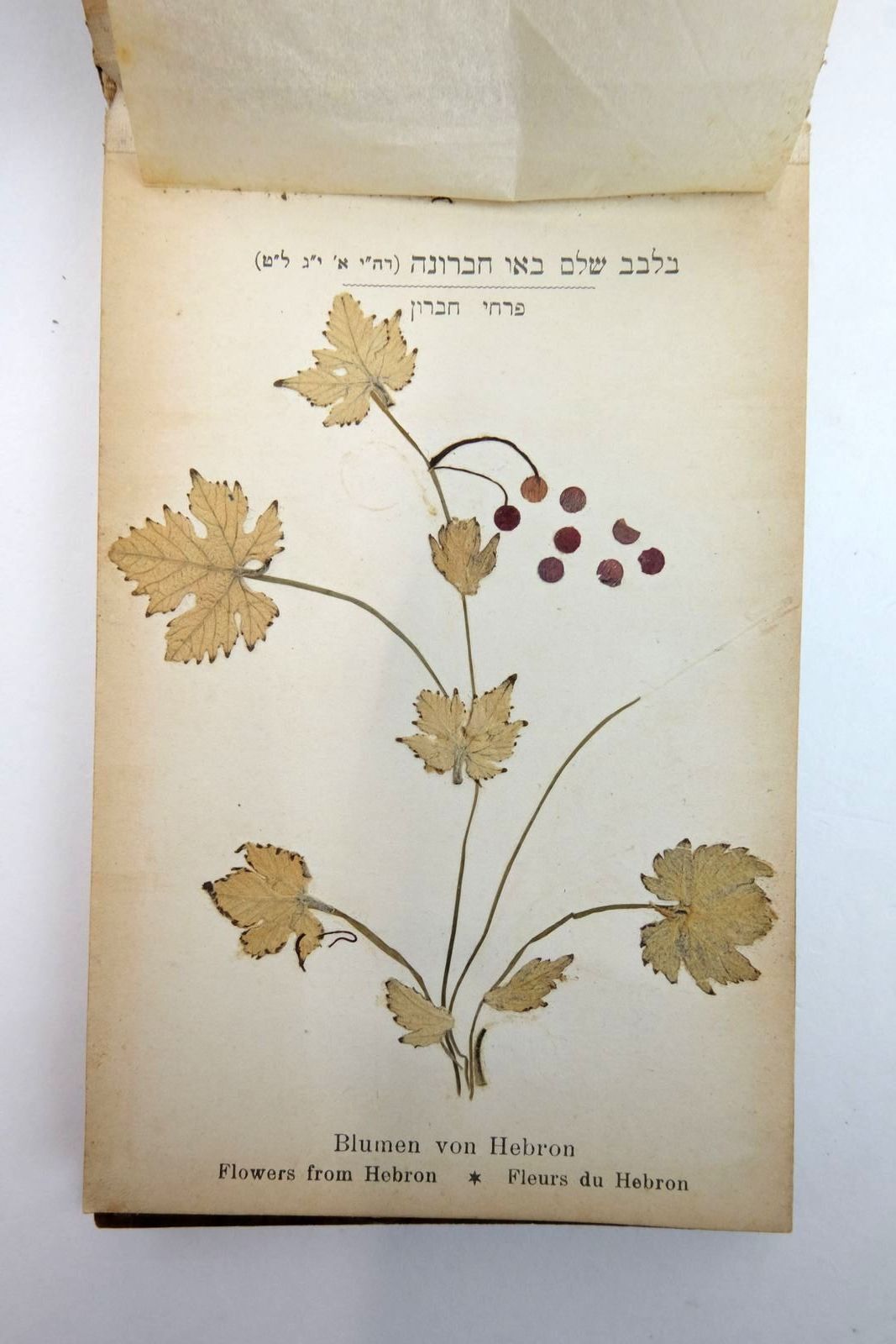 Very good condition. Wood effect covers, what appears to be a leather spine. 12 leaves of card with mounted pressed plant specimens. The accompanying captions are in Hebrew, German, French and English.