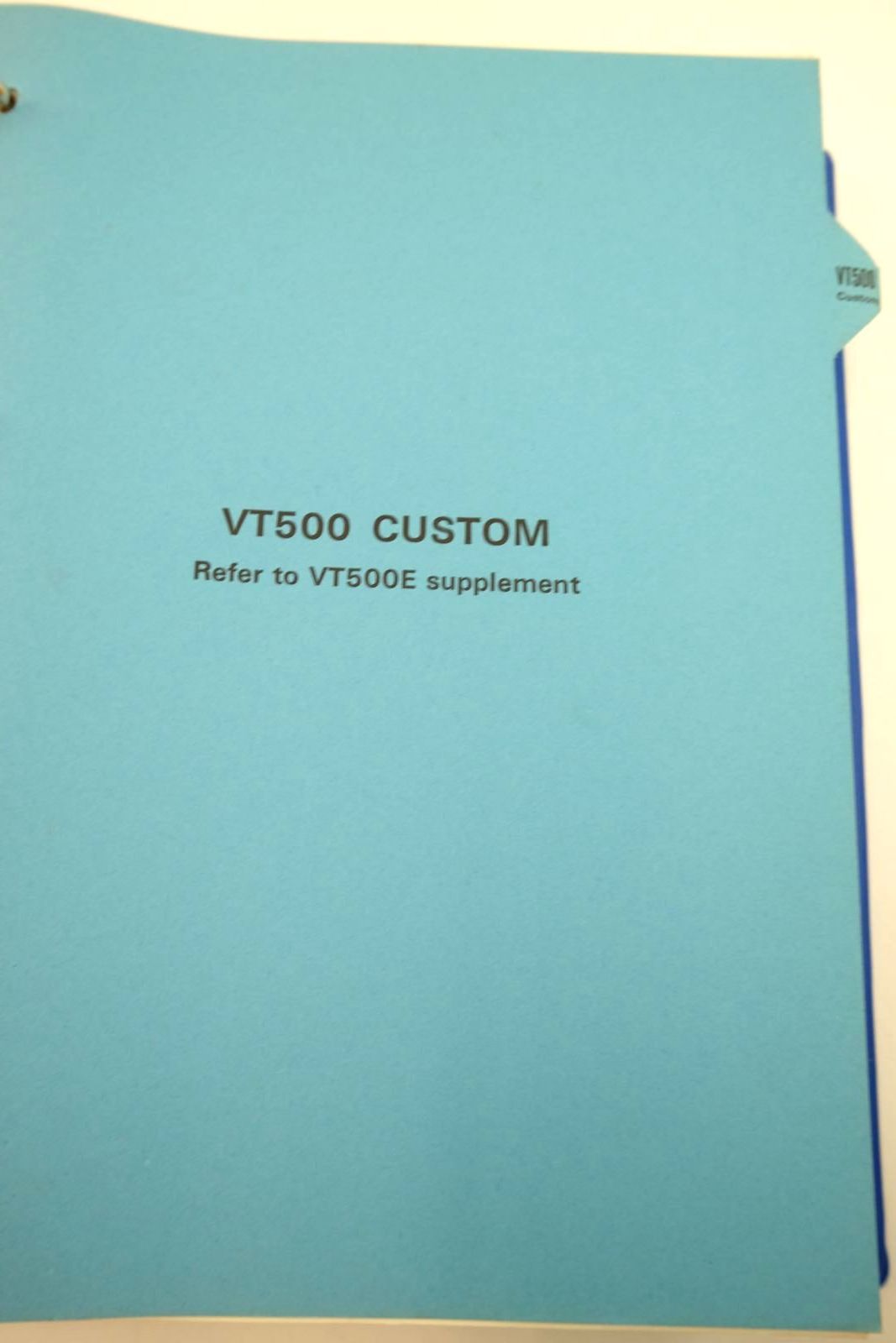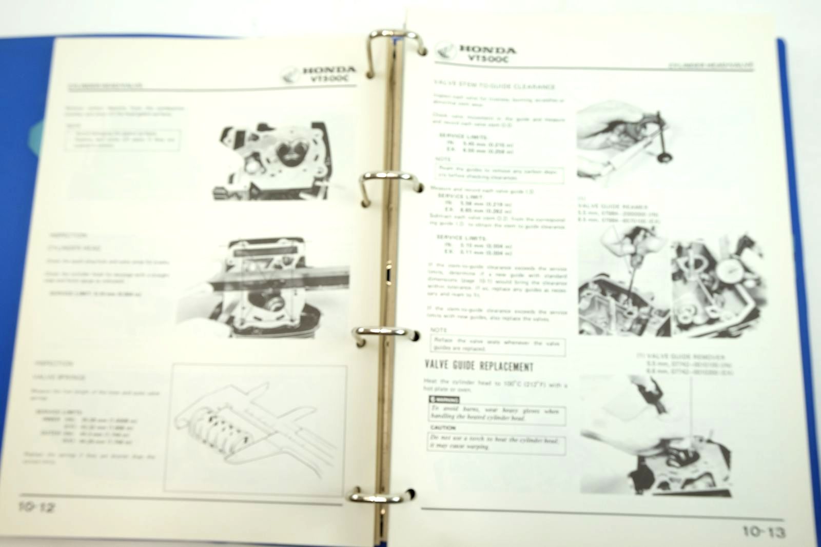 Very good condition. Large format. Ring binder. B/w illustrations. B/w photos. Workshop Manual: VT500 Custom; VT500E Addendum; VT250F.