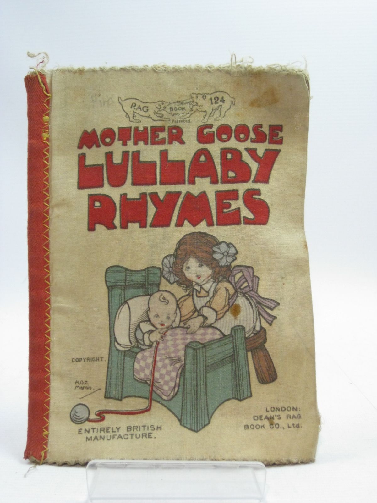 Red cloth spine, cream covers, front shows baby in bed with girl sat beside, rear shows both sat on stool. 5 cloth leaves plus inside of covers gives 12 rhymes with colour illustration for each. No: 124. Covers fraying at spine and edges. A few small red marks to verso. Covers grubby. Pencil marks to a couple of pages. Brown marks to several pages. Contents grubby.