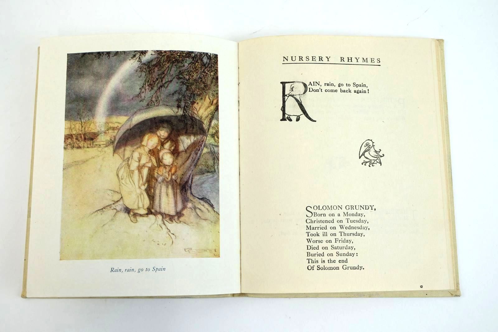Spine and corners bumped. Spine slightly browned and covers a little grubby. Large inscriptions in ink to free-endpapers. Small erasure mark to one page of volume 1 (Rain, rain, go to spain rhyme). Spine of volume 2 was split and has been re-glued. Some light page creases and a few small margin tears.