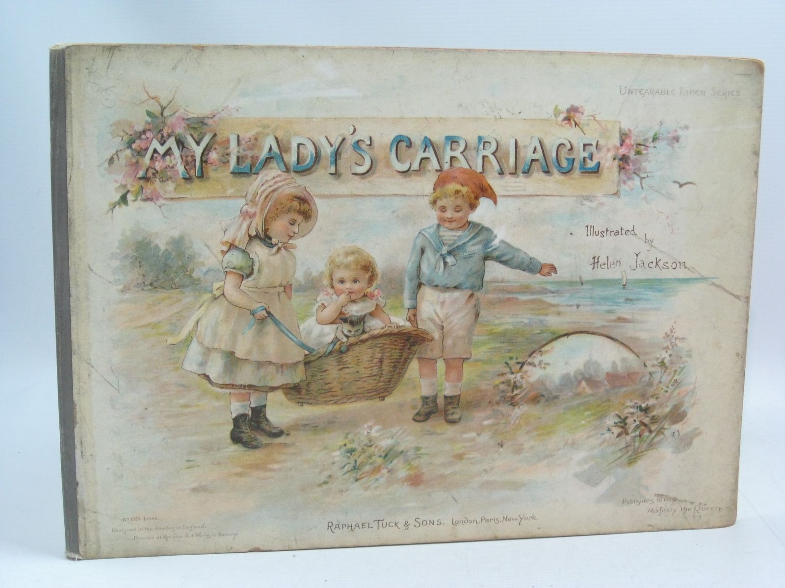 Good condition. Untearable Linen Series. Large oblong format, 9.5 x 13". Pictorial stiff card covers, front shows children carrying smaller child in basket. Pastedown illustrations are two-tone, all other illustrations are colour. No. 1525.