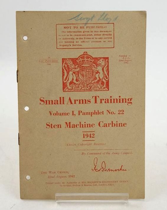 Very good condition. How to load and fire the Sten Machine Carbine. Small format. Beige paperwraps, red title to front. Staple binding with three punched holes. B/w illustrations. 12 numbered pages.