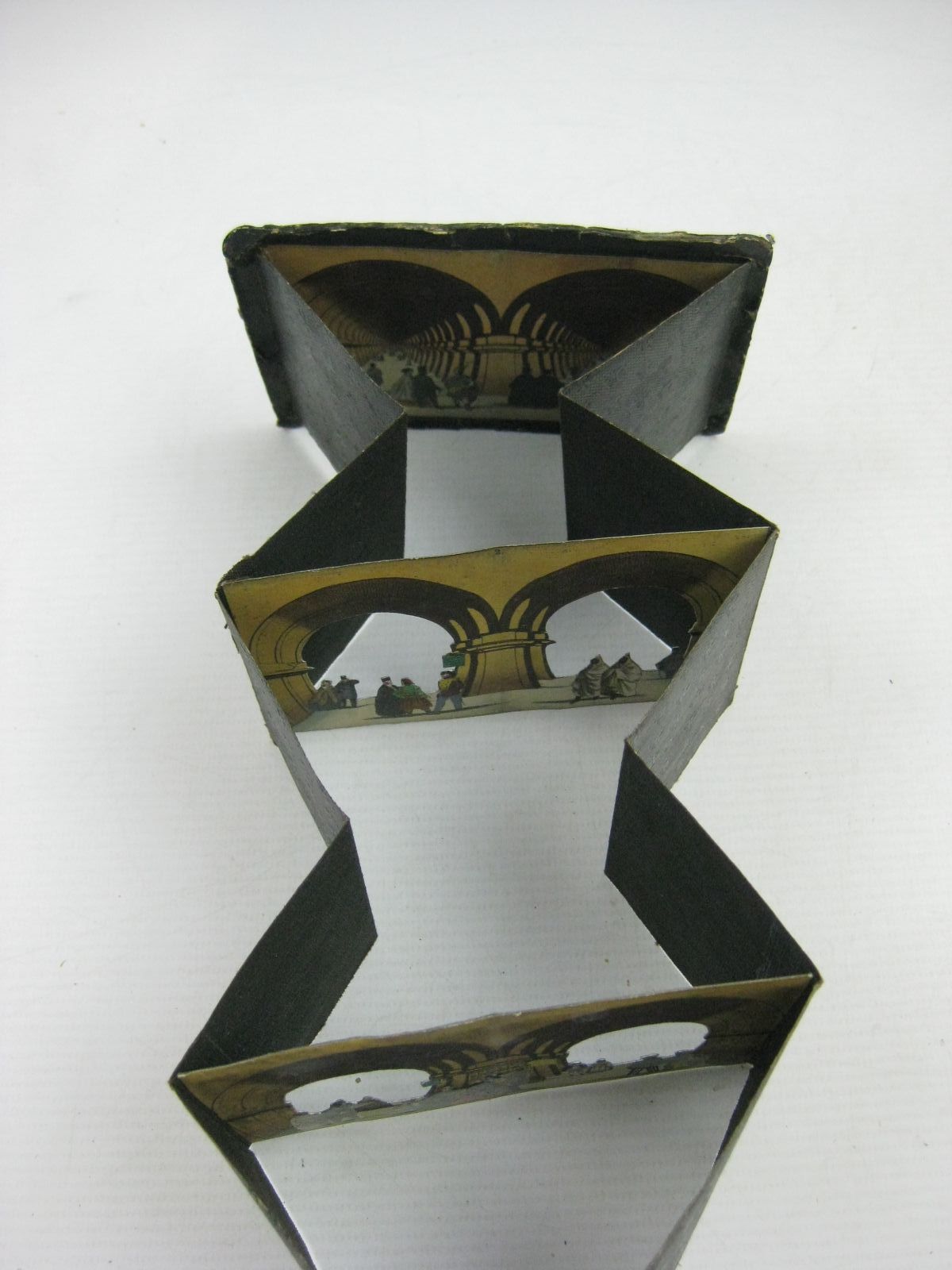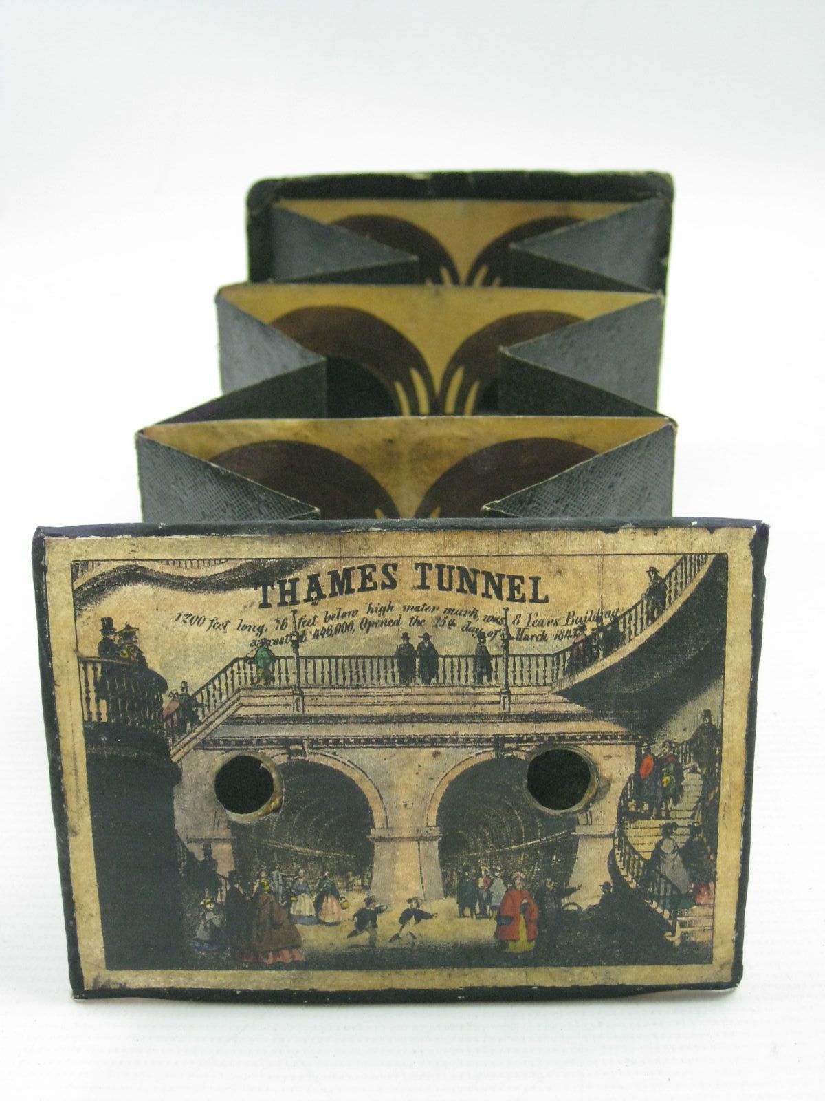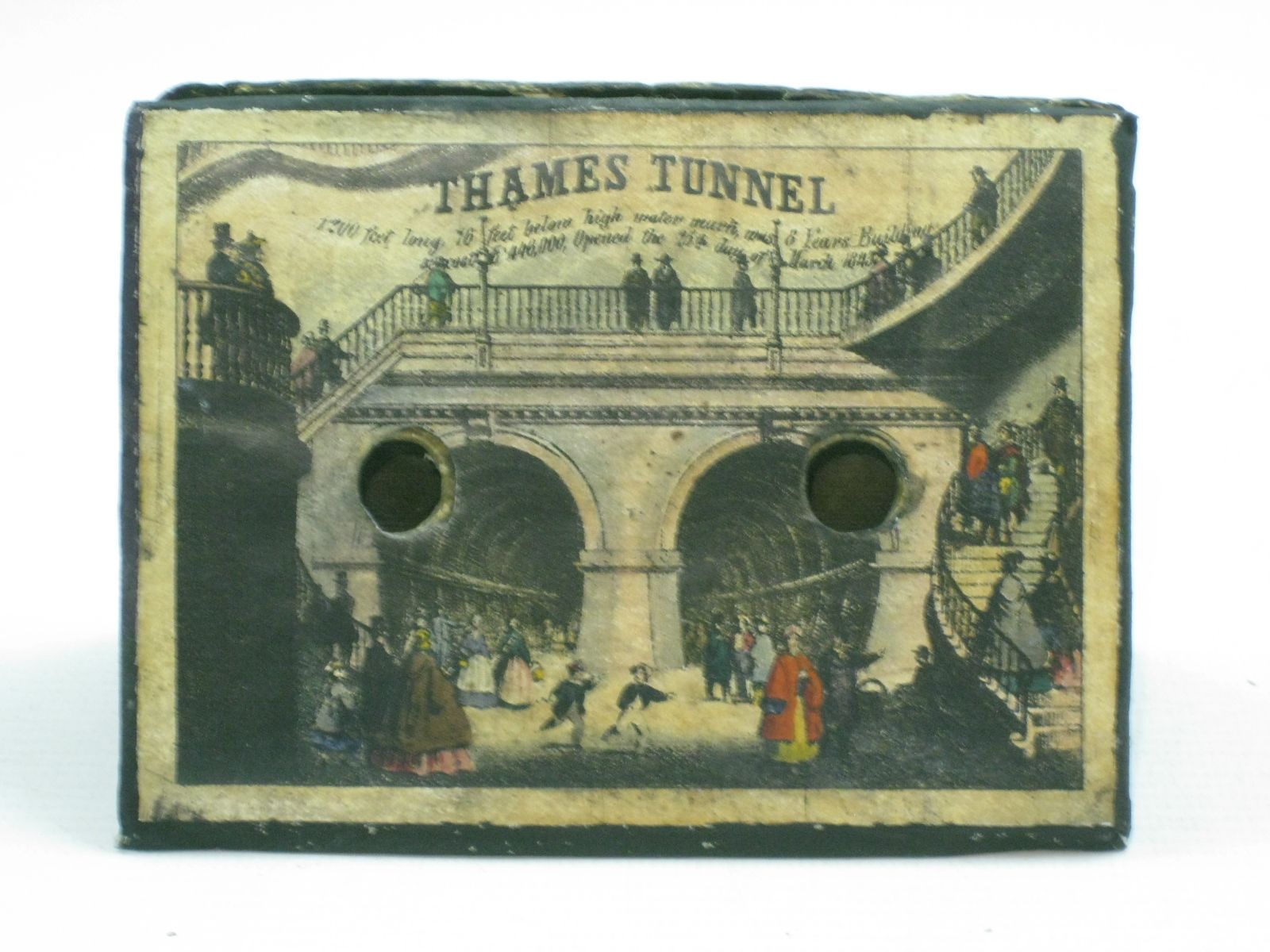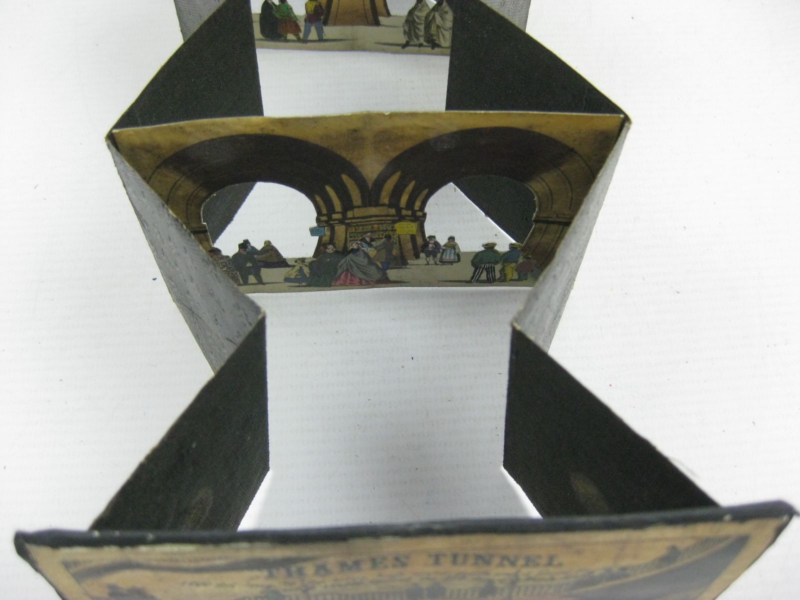 Good condition. 1200 feet long, 76 feet below high water mark, was 8 years building and cost £446,000, opened the 25th day of March 1843. Bound accordion style, 4 hand--coloured scenes (includes front cover which has 2 holes cut out - peepholes). Contained in a slipcase with onlay to front (same as front cover of book).
