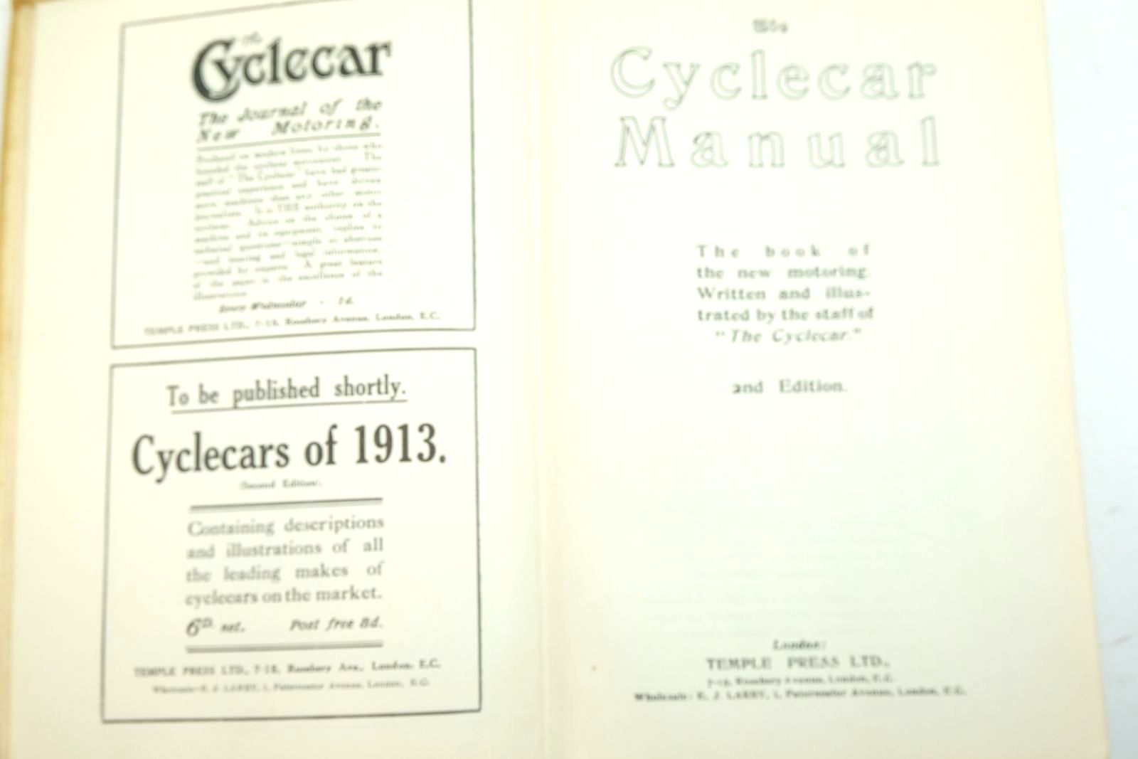 Good condition. Beige cloth with dark brown titles and decorations. Second edition. All about the New Motoring. How to choose, drive and look after a Cyclecar. B/w illustrations and diagrams.