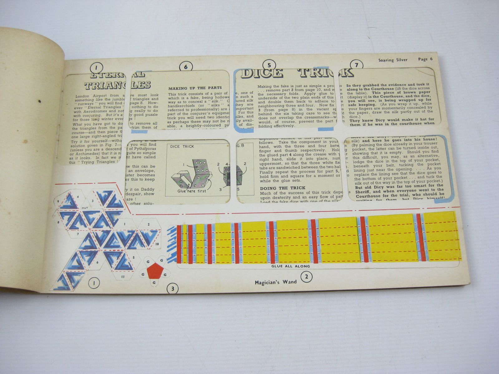 Covers are slightly grubby and edge rubbed. Price to front cover has been covered with a small piece of white (now grubby) paper. Small damp stain to lower edge of rear cover also affects the lower margins of last page of press-out pieces. Staples rusty. Some of the pieces have been removed (Soaring Silver, The Cosmic Cactus and Eternal Triangles). A decent copy of this scarce novelty book.