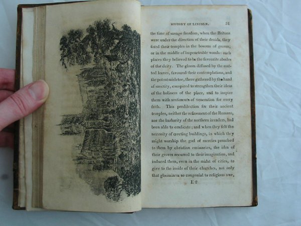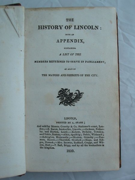 Almost very good condition. The History of Lincoln With a Appendix Containing a List of the Members Returned to Serve in Parliament as Also of the Mayors and Sheriffs of the City. Small format. 7 x 4". 17 b/w plates. 6 b/w chapter head and tail pieces. Full brown leather binding. Gilt title to spine. 312 pages + 27 pages of lists.