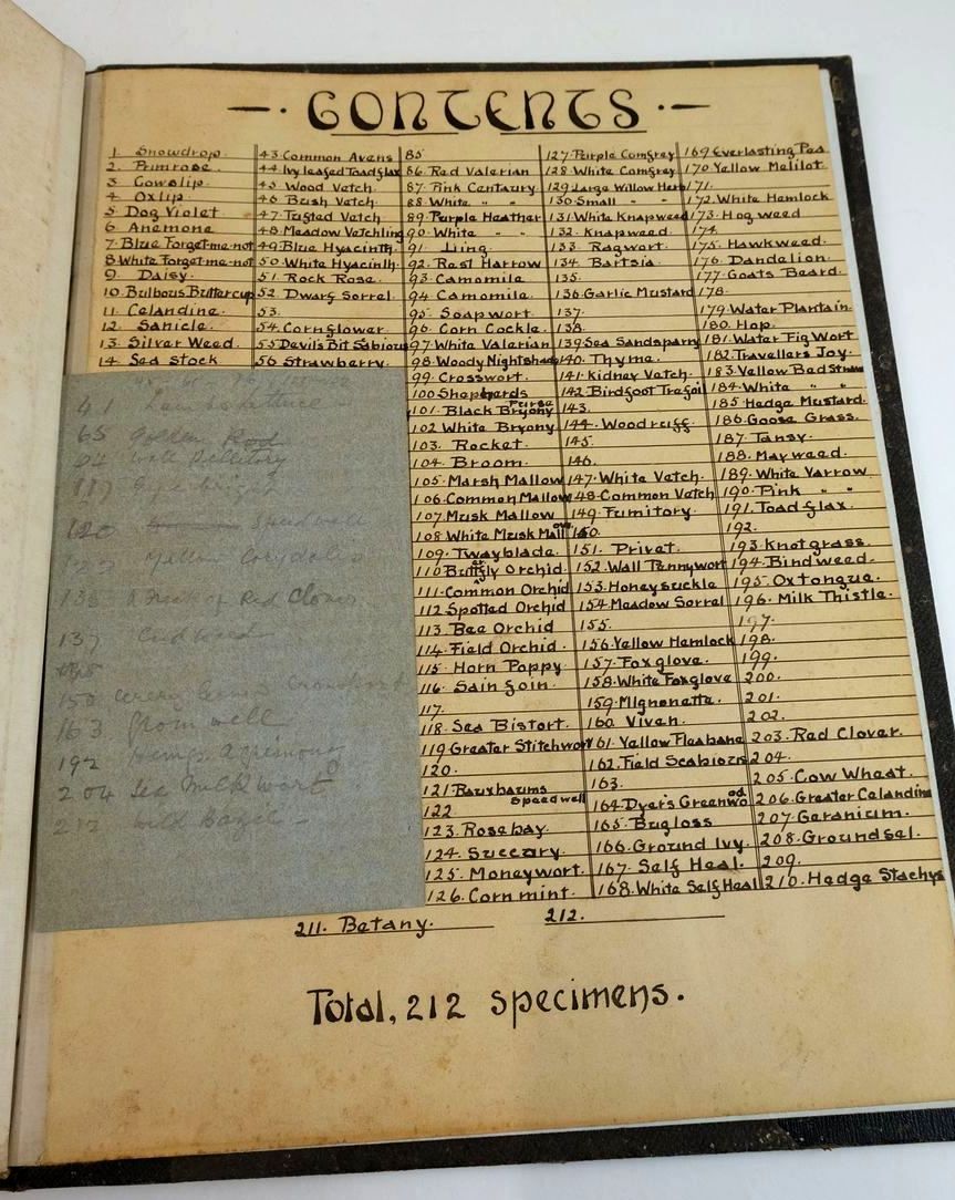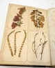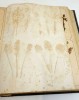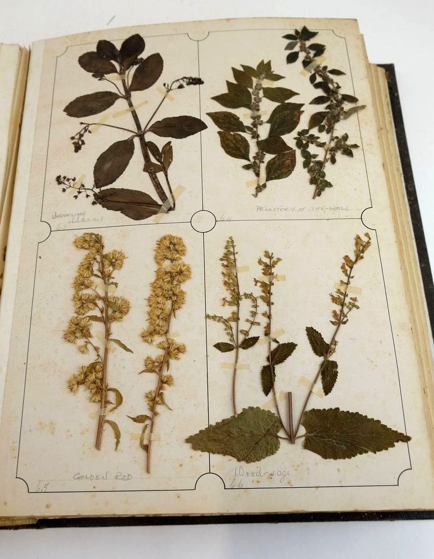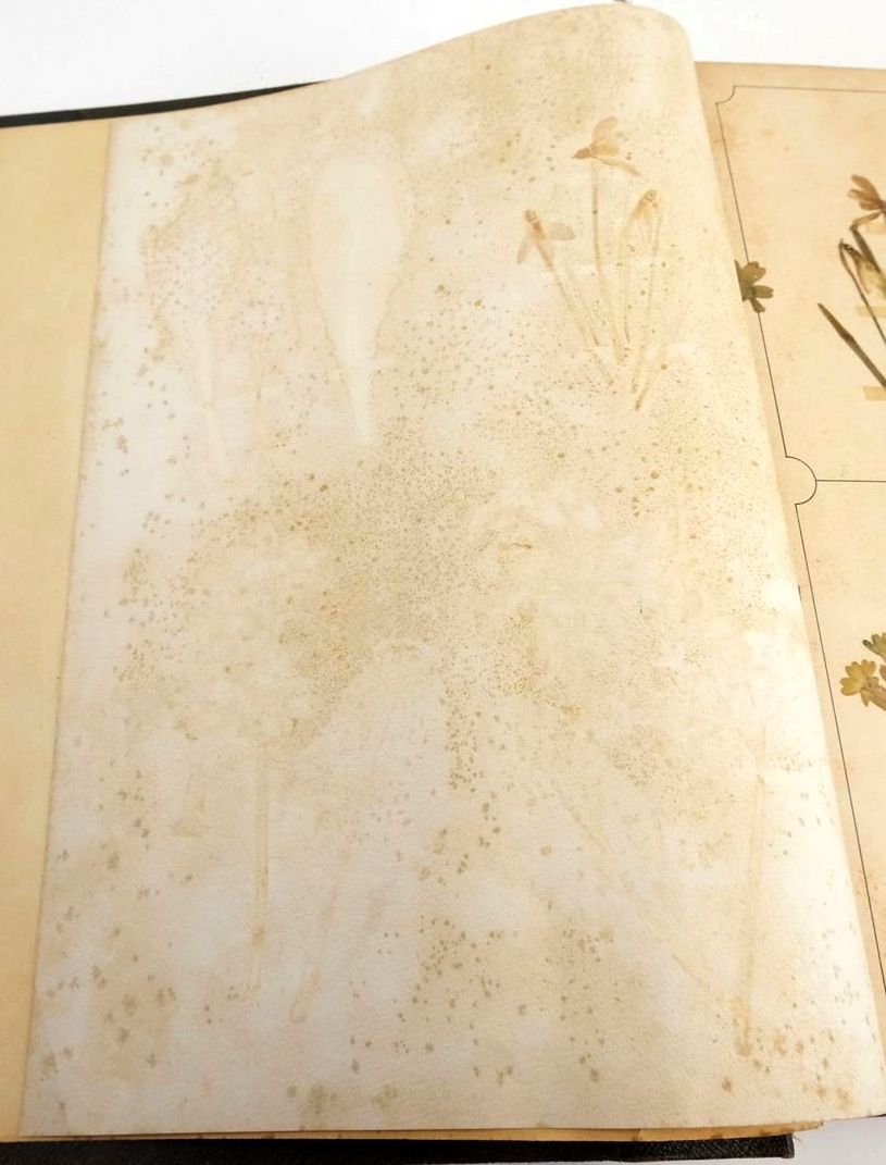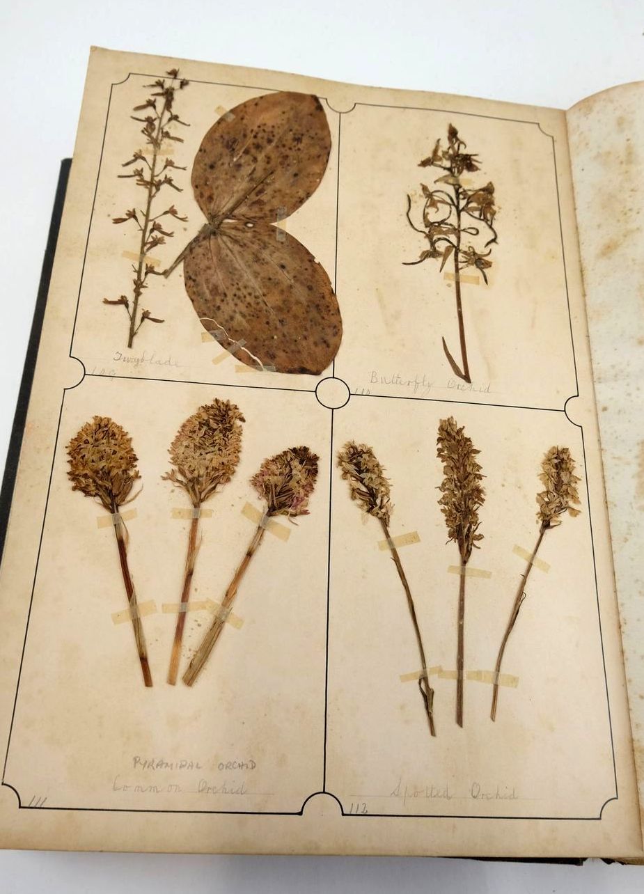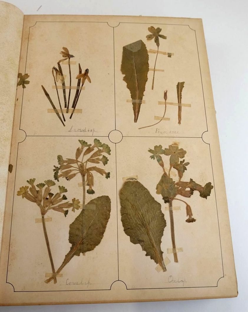 Good condition. An album of pressed flowers from the UK. Very large format. Black leather spine & corners, black cloth sides with gilt title and vignette to front. Flowers are pressed and mounted on card with paper guards. 212 specimens, 4 and 6 per page. Hand-written pencil common name to each specimen. List of Contents handwritten to rear. Pages bound in with cloth.