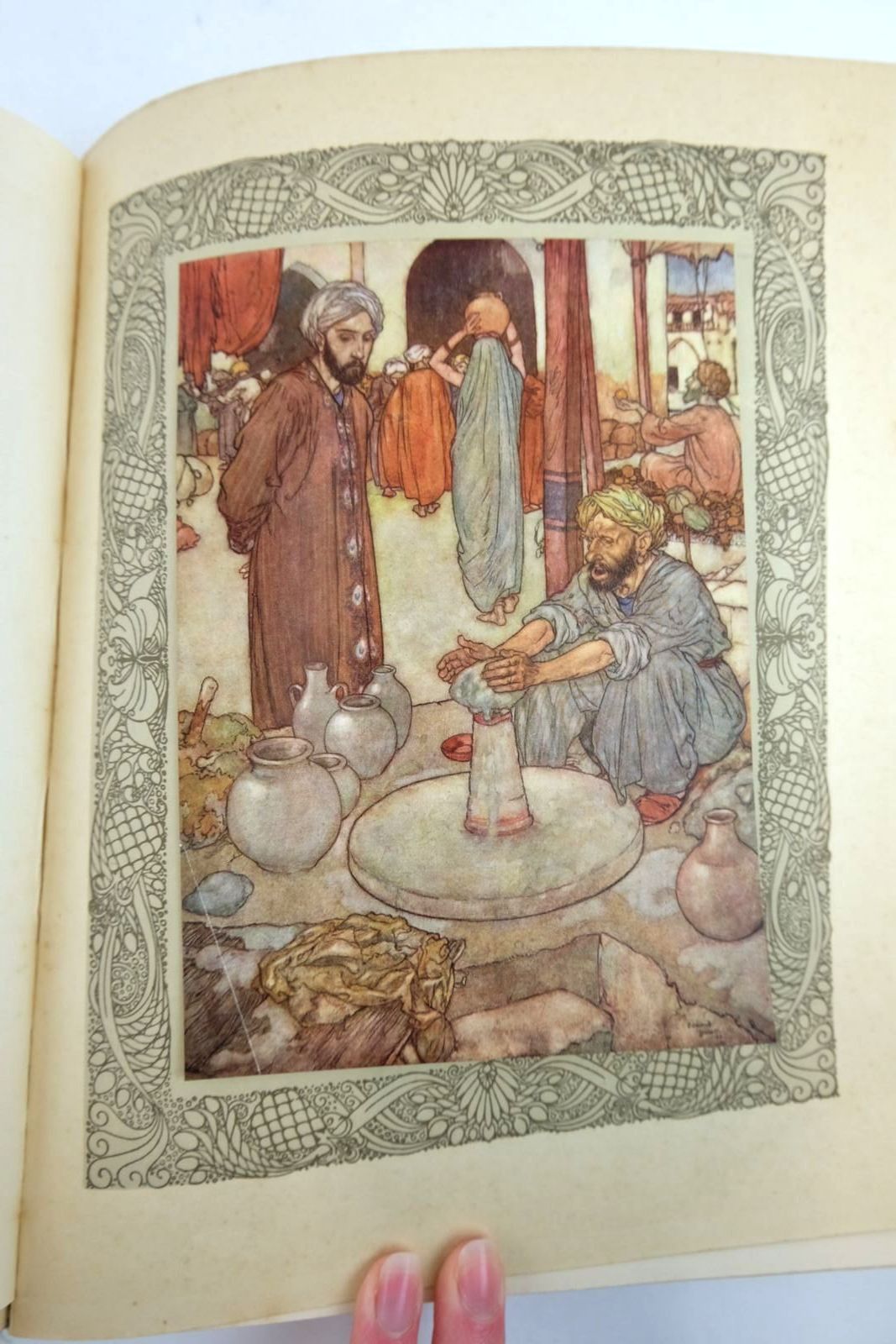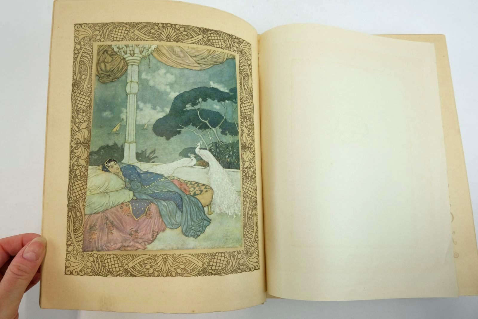 Almost very good condition. The perfect showcase for Dulac's genius in depicting eastern fantasy with 20 magnificent tipped-in colour plates. Cream buckram stamped in rich gilt. Front cover has peacock design above and elephants below a central wreath. Spine has gilt titles and vignette of a flower urn. Peacock feather design on endpapers. Brown decorative border to each page. 11.25 x 8.75". Unpaginated.