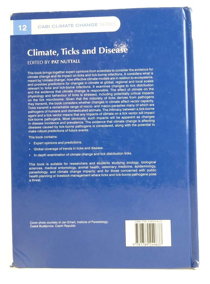 Very good condition. Number 12 in the CABI Climate Change Series. Considering the evidence for climate change and its impact on ticks and tick- borne infections. Blue glazed pictorial boards. Colour graphs and charts.