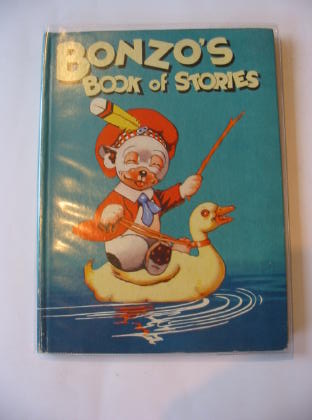 Green pictorial boards showing Bonzo riding the back of a duck on water. Two-tone illustrations throughout. 76 pages. First story "Let's Pretend". Large format. A lovely copy of this scarce item with a little bit of rubbing to board edges. Contents and boards lovely and bright.