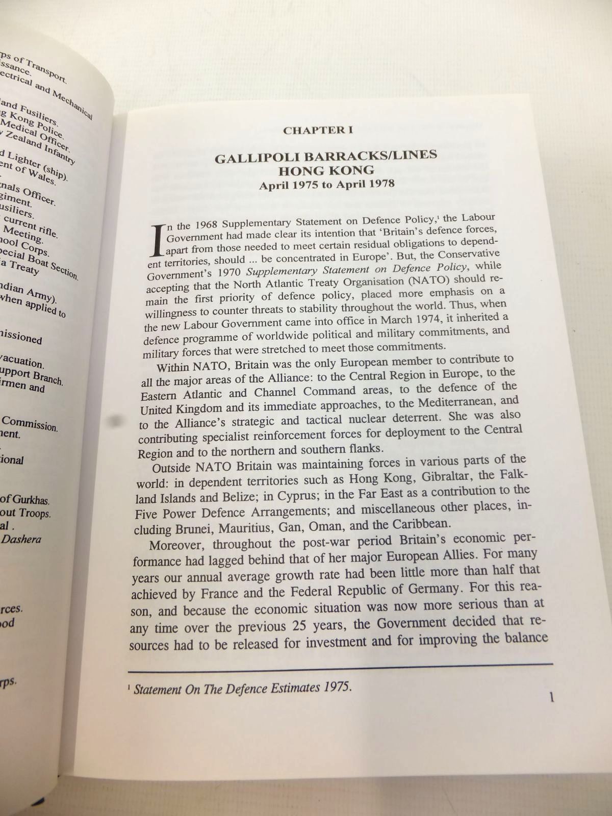 Fine condition in a nearly fine dustwrapper. Third and final volume of the history of this regiment. A story of many tours of duty on the Hong Kong border, of service in the UK and Belize, and always of incessant training, interspersed with much sport and enjoyment. Green boards, silver title to spine and logo to front. B/w photos. xii and 386 pages.