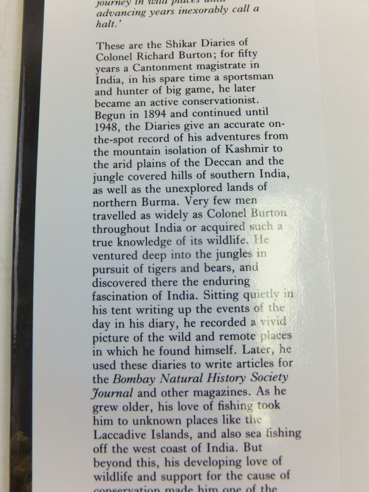 Nearly fine condition in a very good dustwrapper. Pages from the Shikar Diaries - 1894 to 1949 of Colonel Burton, Sportsman and Conservationist.
