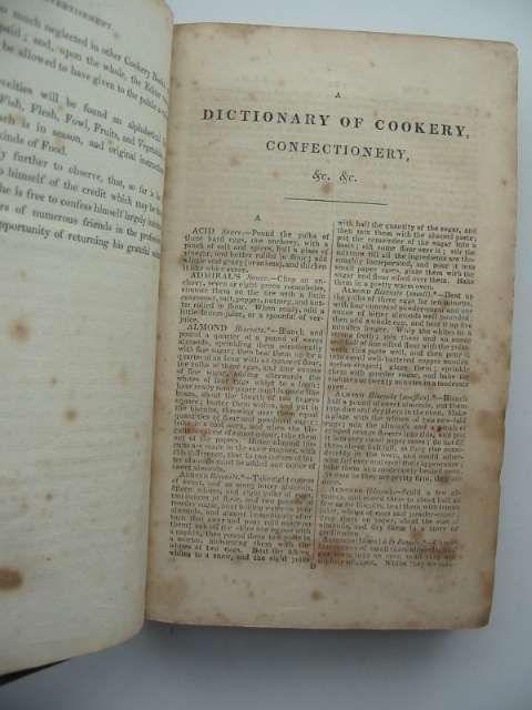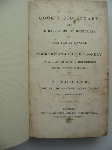 Very good condition. The Cook's Dictionary and House-Keeper's Directory: A New Family Manual of Cookery and Confectionery, On a Plan of Ready Reference Never Hitherto Attempted. Modern binding, brown cloth with gilt title to spine. iv + 516 pages.