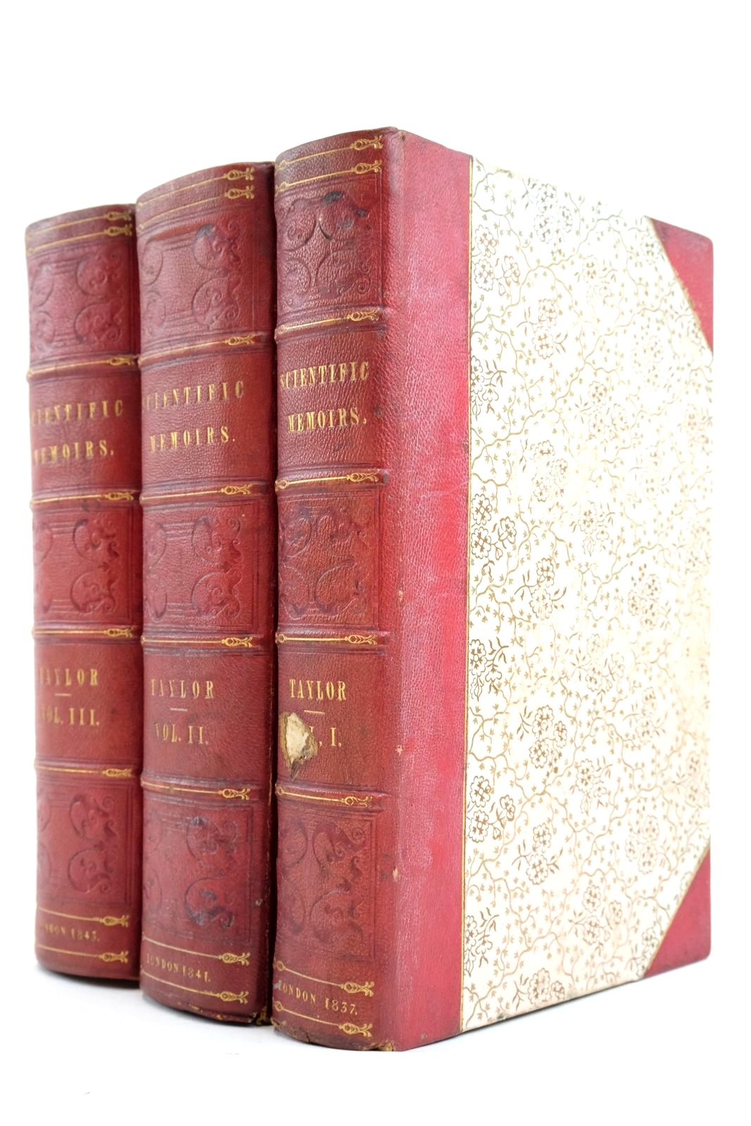 Good condition. And From Foreign Journals. Red leather spines and corners; raised bands to spines; gilt titles. Contains plates (some fold-out) and illustrations. Volume III contains 'Sketch of the Analytical Engine' invented by Charles Babbage - considered to be the forerunner of 20th century computers.