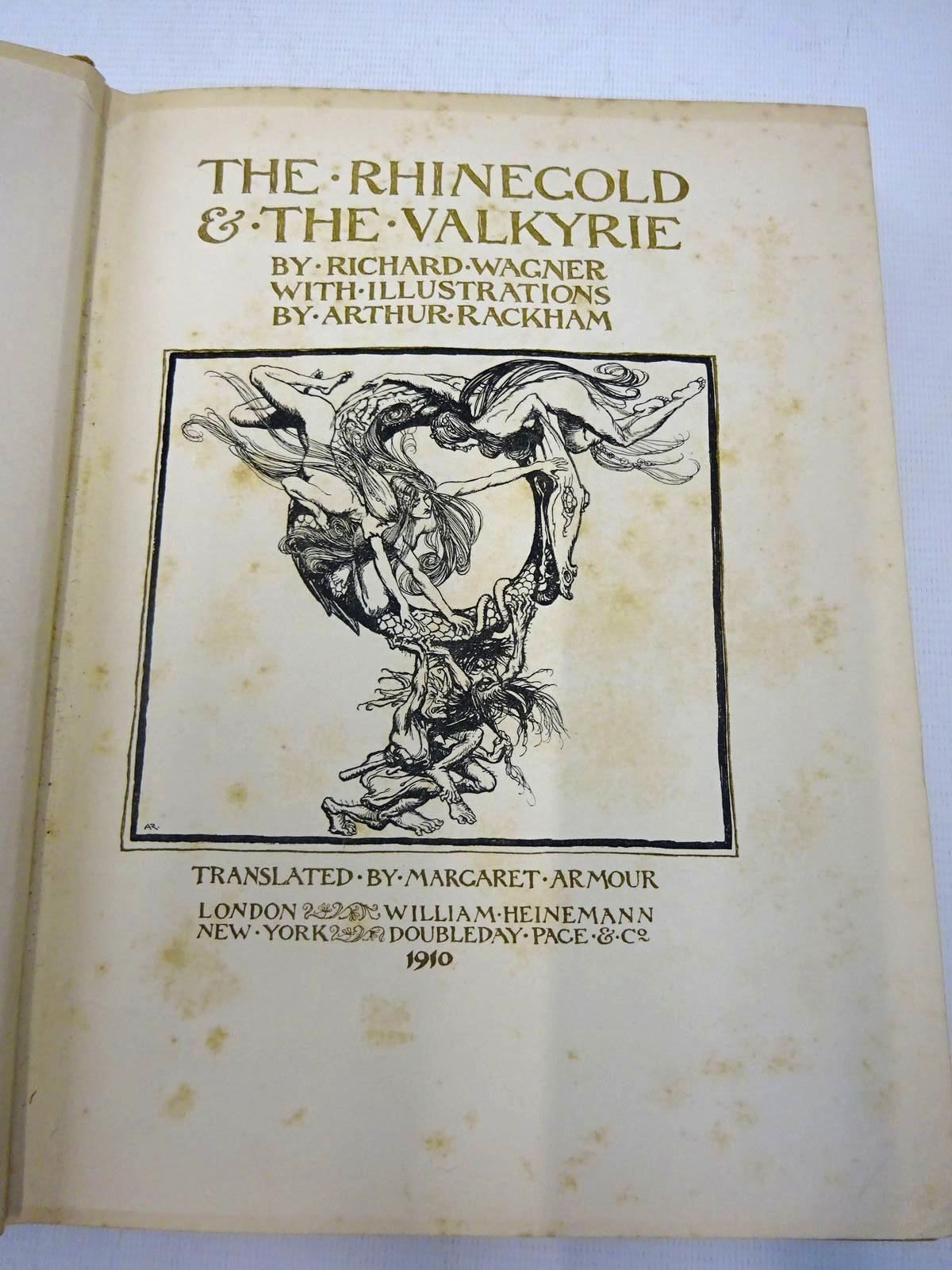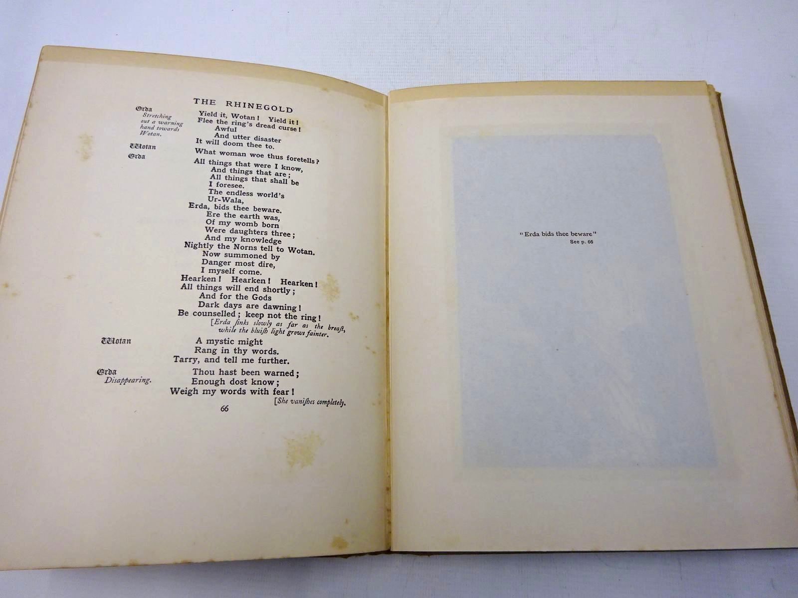 Almost very good condition. Trade edition. Brown cloth. Gilt titles and decorations to spine and front cover. Cream and orange pictorial endpapers. Part of the trilogy of 'The Ring of the Niblung'. With a prelude by Richard Wagner. Translated into English by Margaret Armour. 34 beautiful tipped-in colour plates, covered with captioned tissue-guards. Text in a play format.