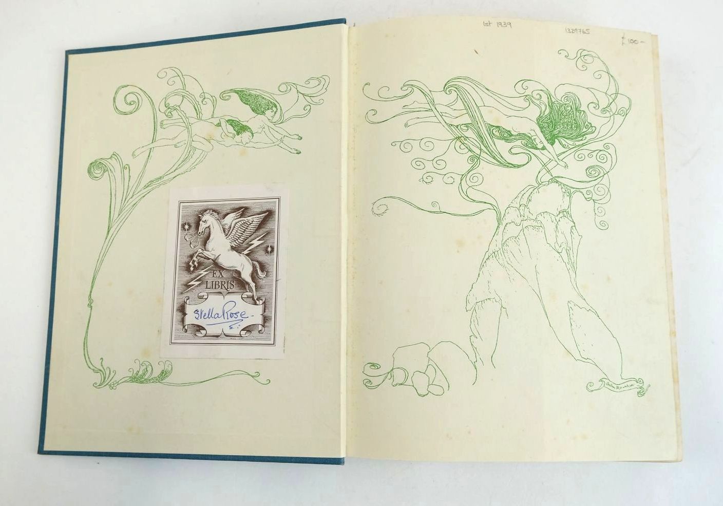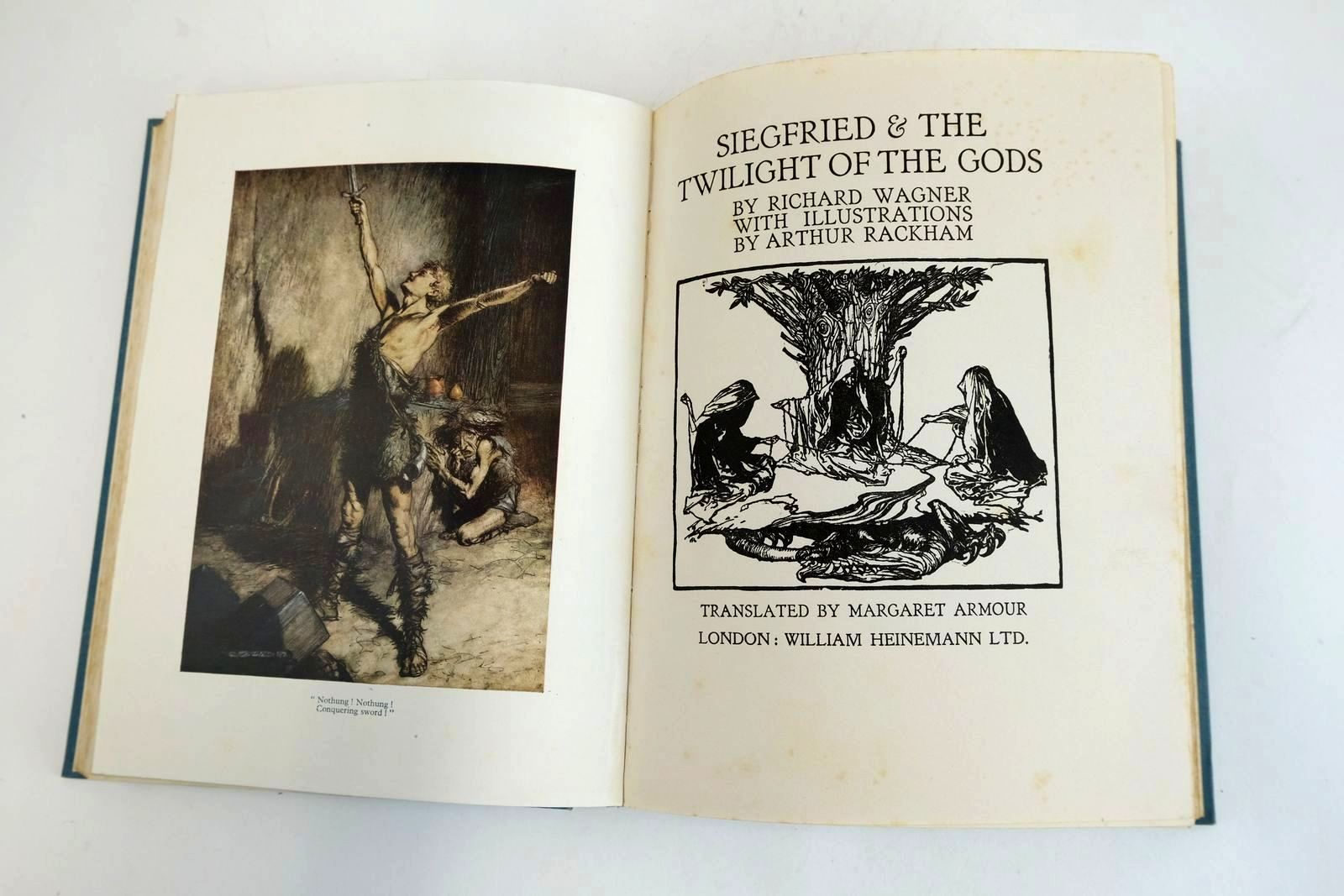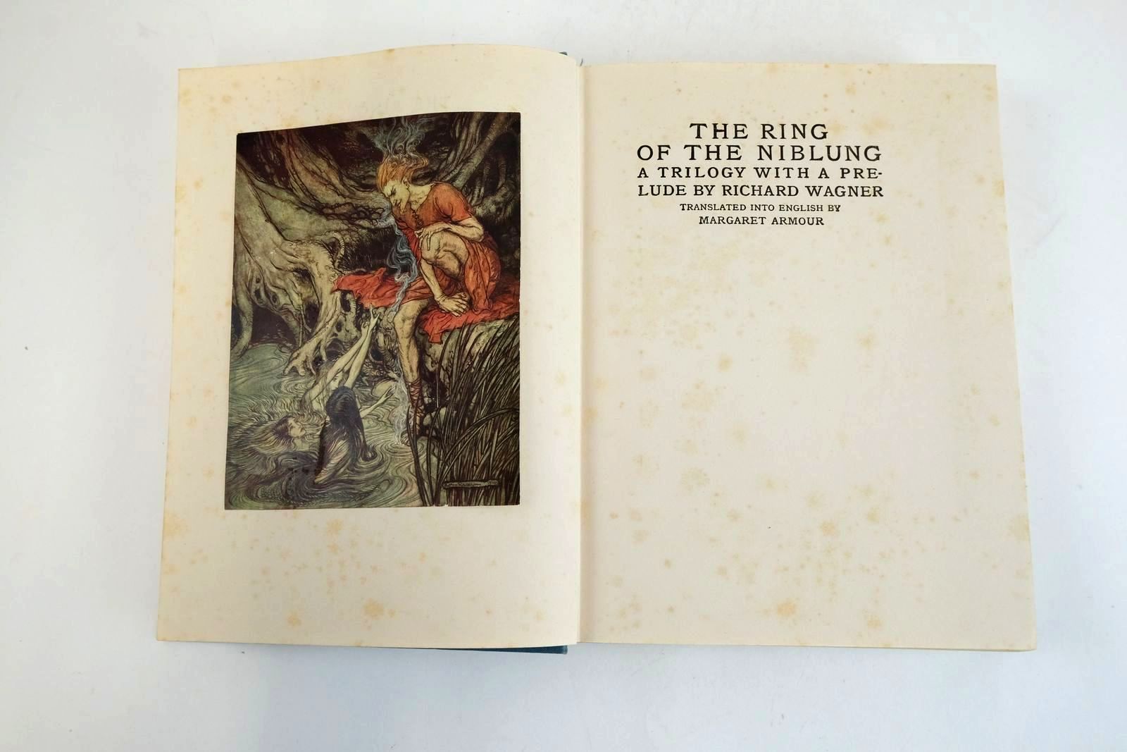 Almost very good condition. A Trilogy With A Prelude By Richard Wagner. 2 Volumes in 1: The Rhinegold and The Valkyrie; Siegfried and the Twilight of the Gods, originally published in 1910 and 1911. 48 dramatic colour plates and b/w decorations. Blue cloth, black titles. Green/white pictorial endpapers.