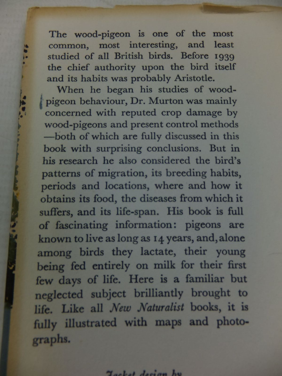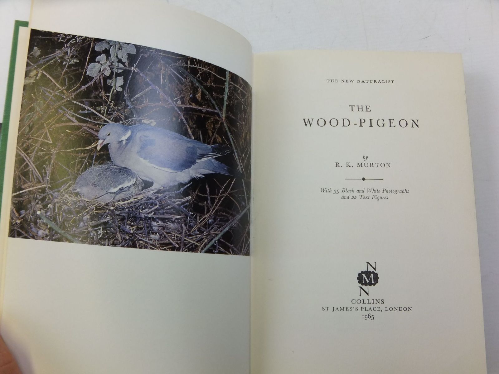 Slightly better than very good condition in a very good dustwrapper. A 'New Naturalist' Monograph No. 20. Green buckram cloth. 39 b/w photographs. 22 text figures. Coloured plate frontispiece. A fascinating study of the wood-pigeon, the least studied of British birds. Dr. Murton reveals the particularly long life span of the wood-pigeon, 14 years, and also reveals that wood-pigeons are unique among bird life in that they lactate, with their young being fed entirely on milk for the first few days of life.