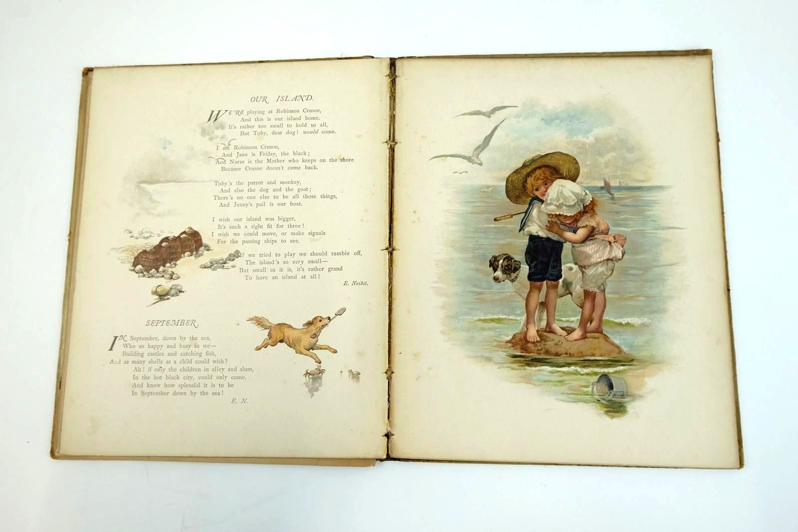 Fair condition. 12 full-page and 2 double-spread beautiful chromolithograph illustrations featuring children. Numerous text illustrations. Pictorial front board, brown cloth spine. Floral decorated endpapers. Unpaginated. 11 x 8.5". A lovely walk through the twelve sesons in verse.