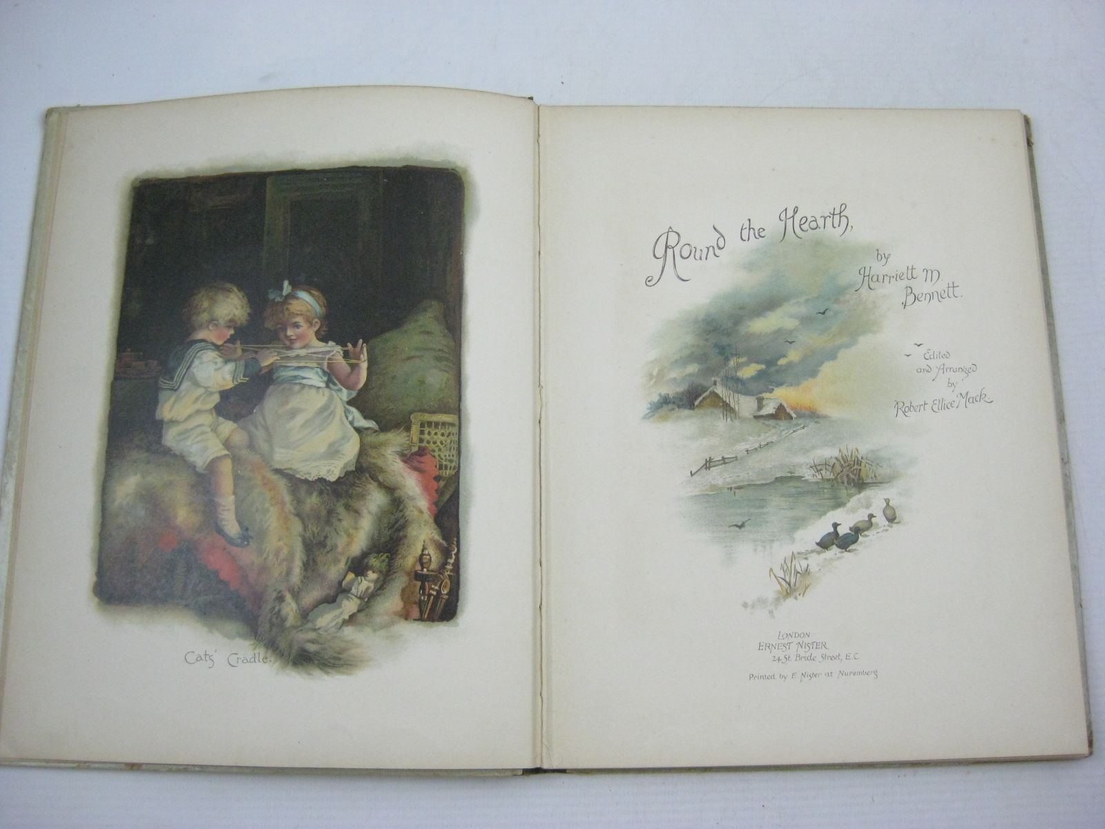 Very good condition. Cloth spine. Pictorial front board shows children beside a roaring fire. 10 x 7.5". 21 chromolithograph plates (including 1 double-spread). Colour and tinted text illustrations.