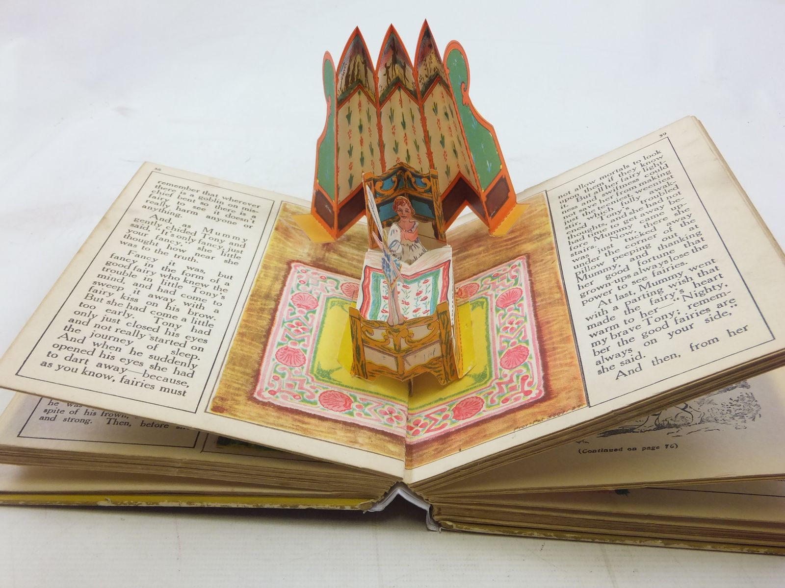 Corners and board edges worn with surface loss. Sides of spine split, re-glued and repaired with matching paper to disguise loss. Front joint pulled, showing binding cords. Colouring to one b/w illustration. Some hinges pulled. Pop-ups in working order.