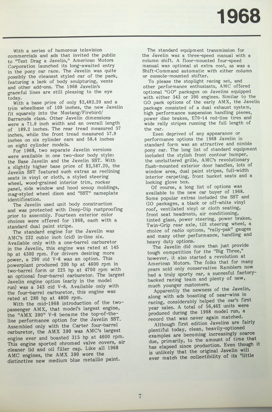 Very good condition. The exciting story of one of America's greatest pony cars! From the original Javelin in 1968 to the last of the line in 1974. Edited and annotated by Campbell. Green cardwraps. B/w photos throughout. 144 pages.