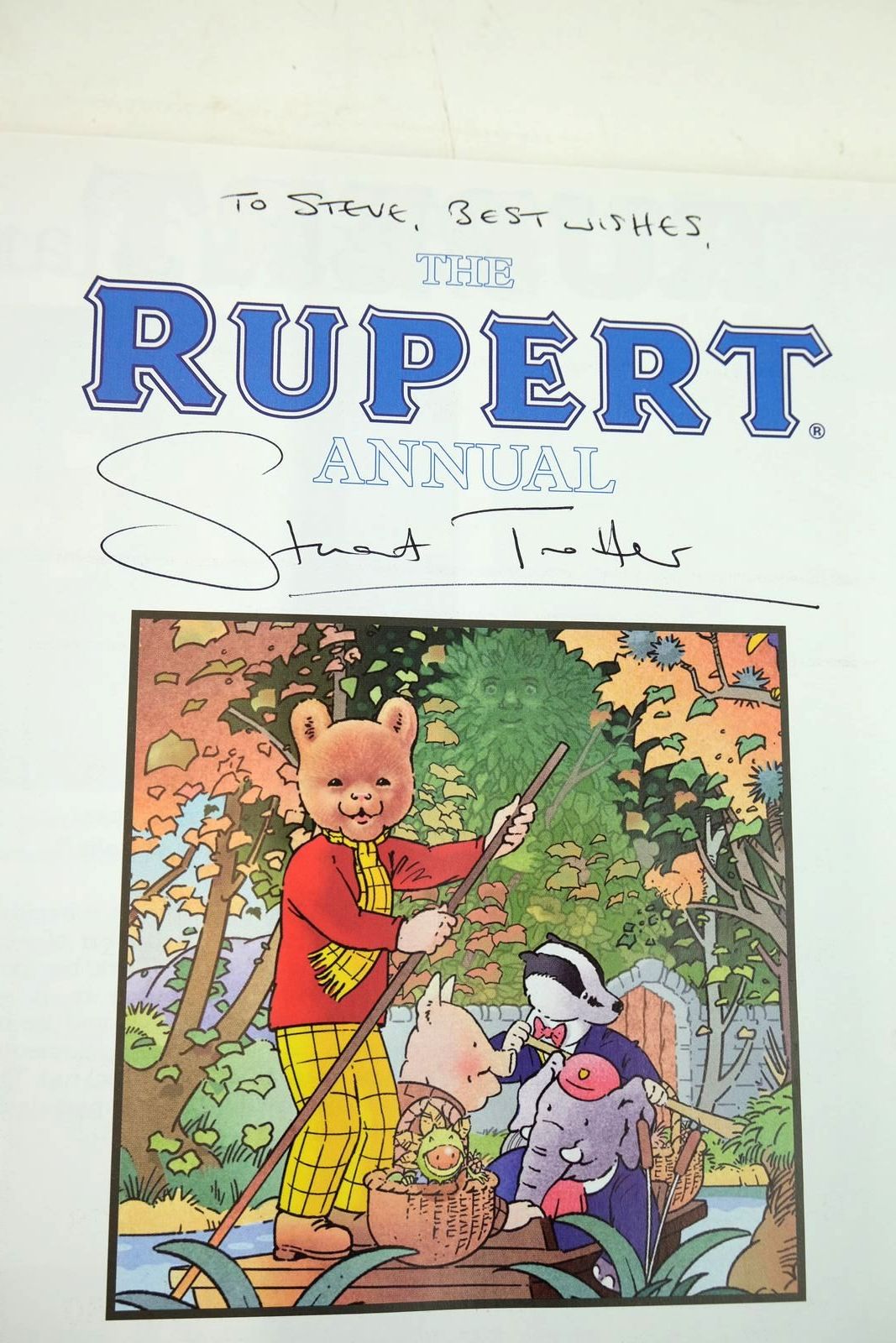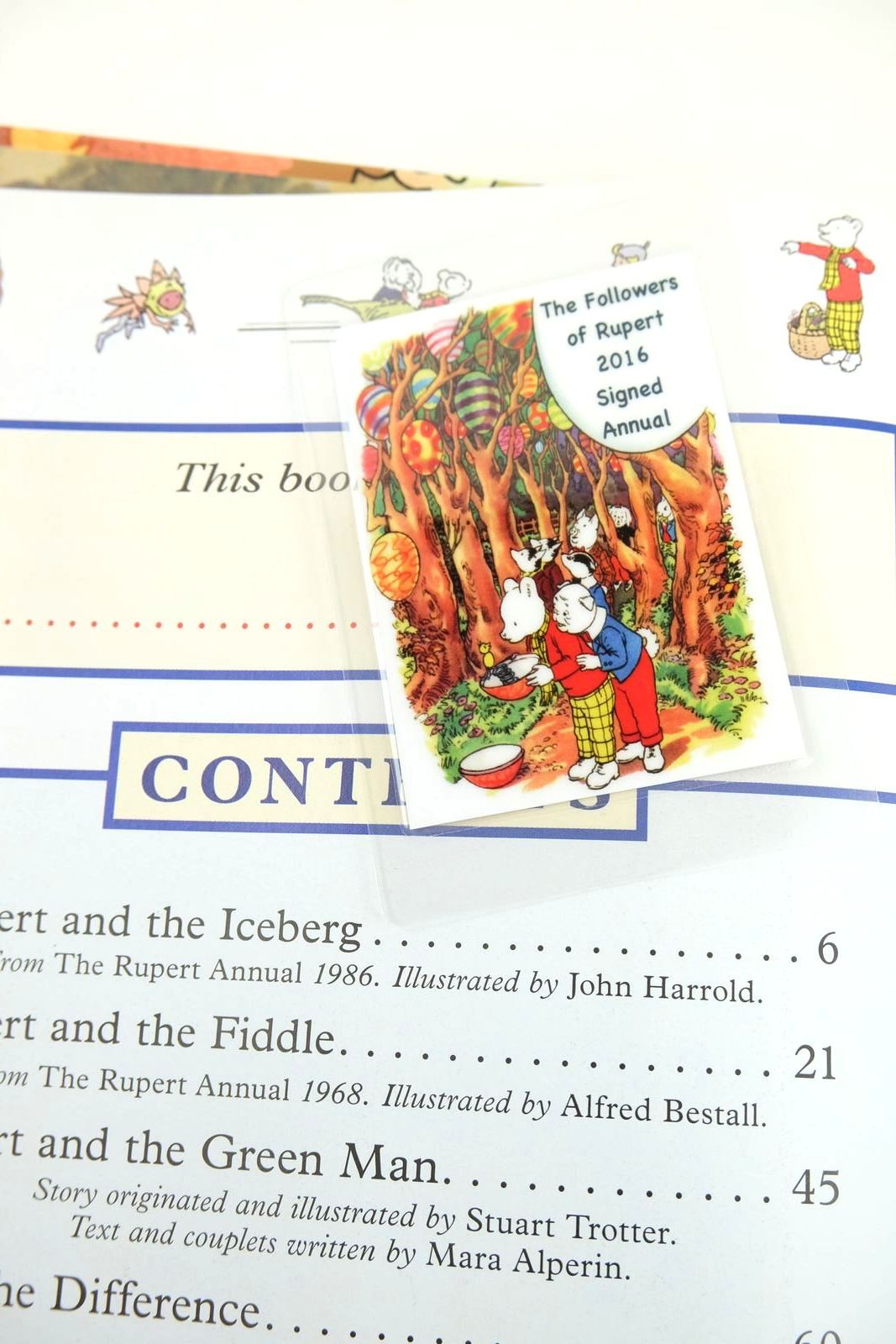 SIGNED by Stuart Trotter, with dedication to a previous owner on title page. Also contains a small laminated card that says 'The Followers of Rupert 2016 Signed Annual.