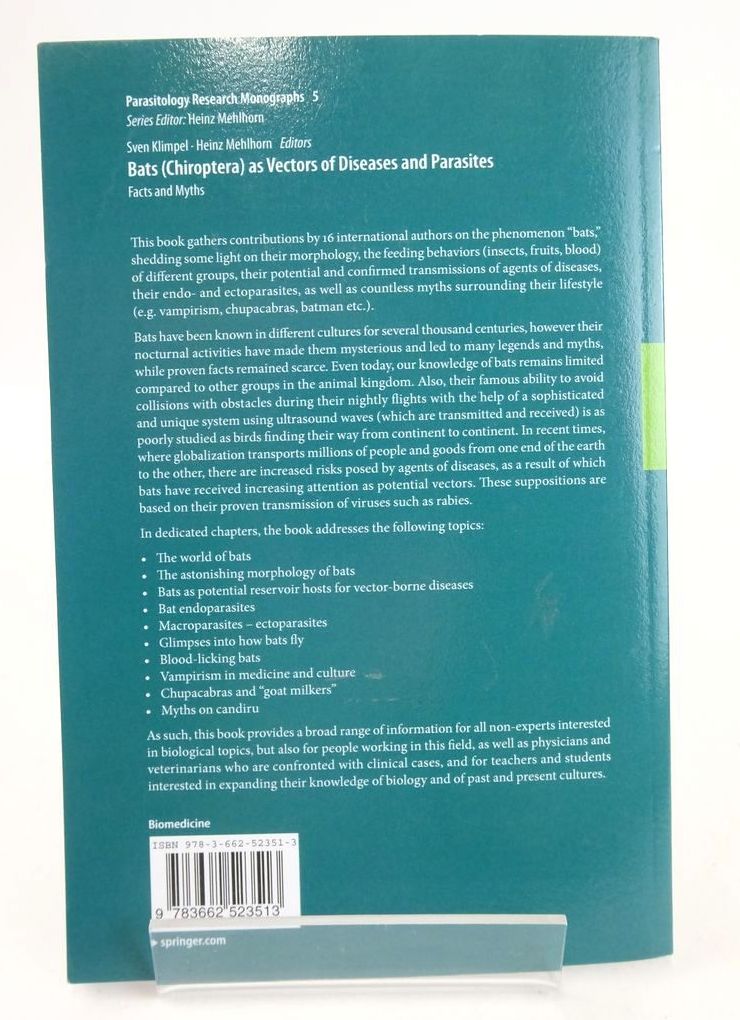 Slightly better than very good condition. Parasitology Research Monographs 5. Edited by Klimpel and Mehlhorn. Contributions by 16 international authors on the phenomenion "bats," shedding some light on their morphology, the feeding behaviors (insects, fruits, blood) of different groups, their potential and confirmed transmissions of agents of diseases, their endo- and ectoparasites, as well as countless myths surrounding their lifestyle (e.g. vampirism, chupacabras, batman etc). Green cardwraps. Colour & b/w illustrations.