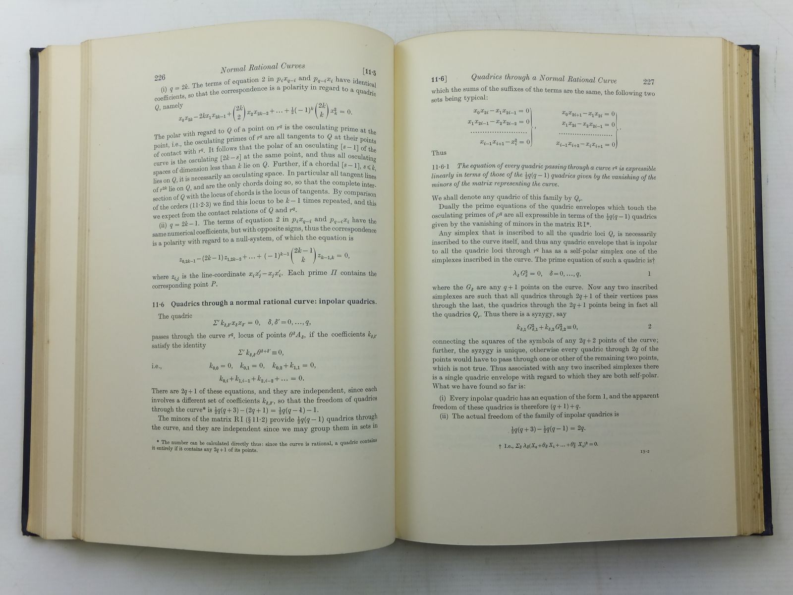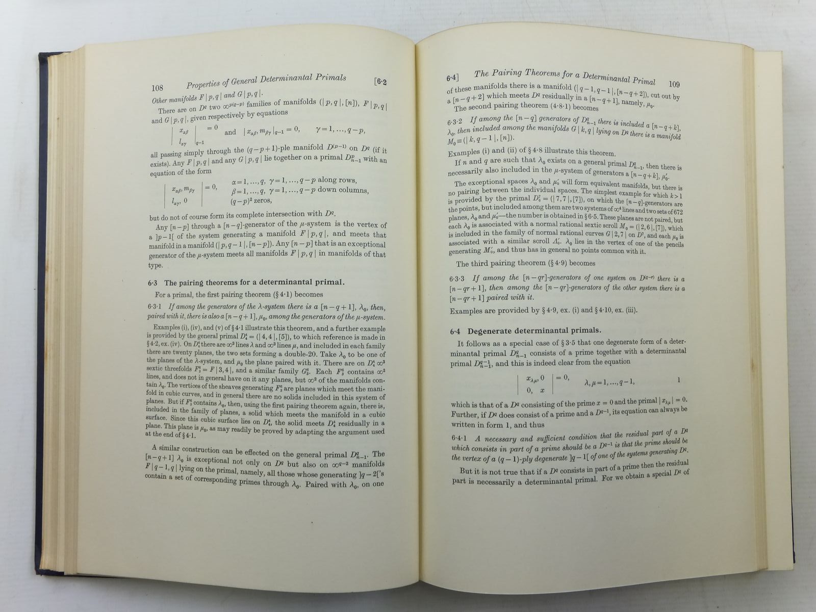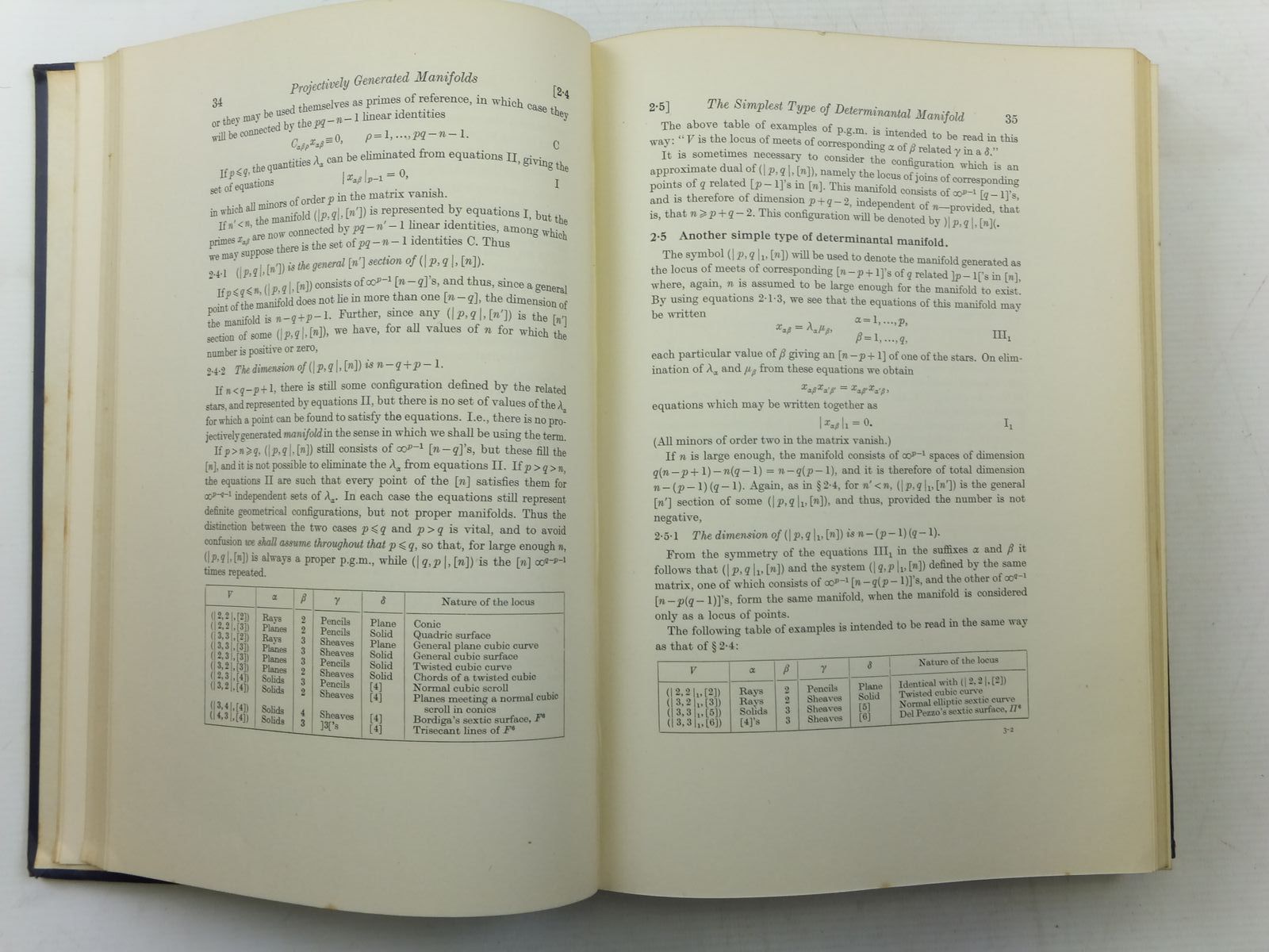 Very good condition. Large format. Blue cloth with gilt title to spine. The book contains 3 parts. Part I - Looks at Manifolds Defined by Matrices of General Form; Part II: Manifolds Defined by Matrices of Special Forms; Part III: Determinantal Quartic Primals In Space of Four Dimensions.