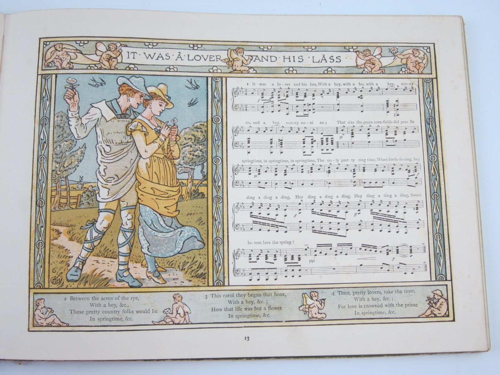 Almost very good condition. A Book of Old Songs, Newly Arranged, & with Accompaniments by Theo Marzials Set to Pictures by Walter Crane. Engraved and Printed in Colours by Edmund Evans. Each song set in a decorative border and illustrated in pastel colours. A beautiful book. Green decorative boards and endpapers. 52 pages. 9 x 12".
