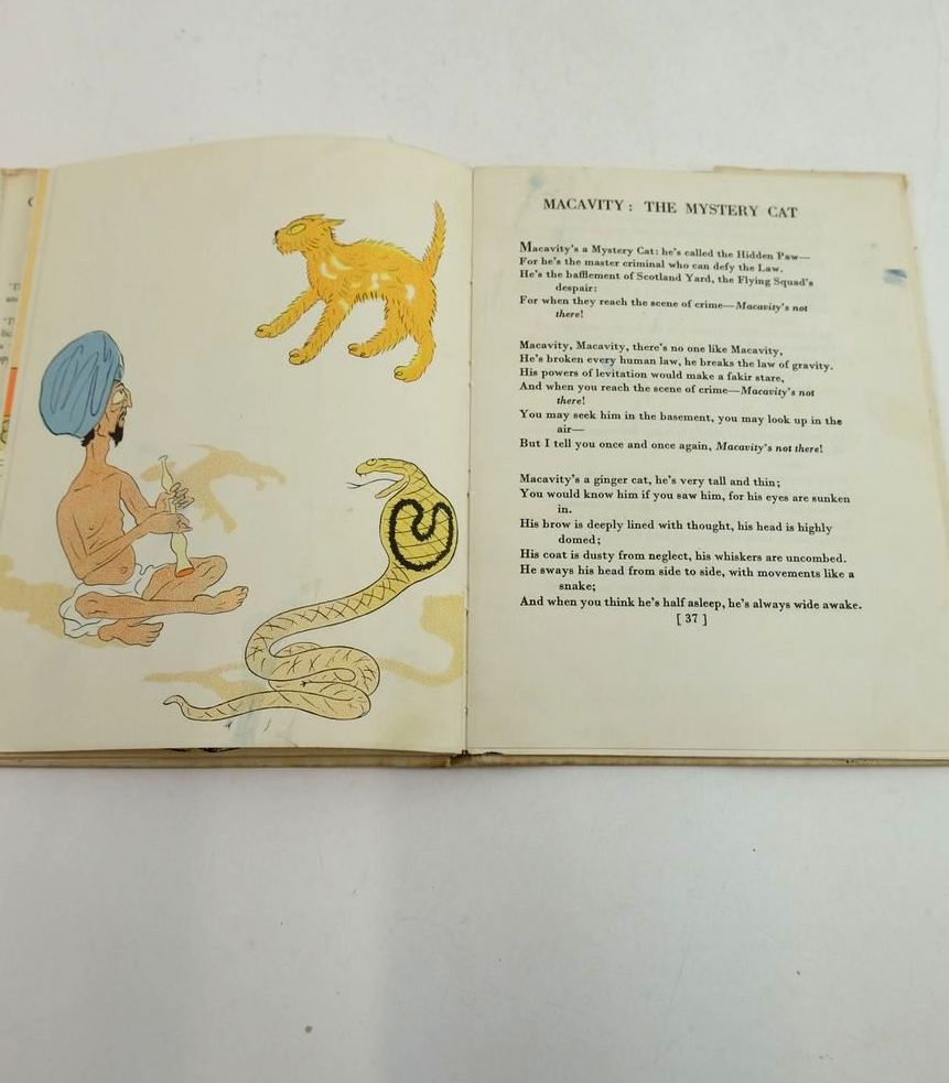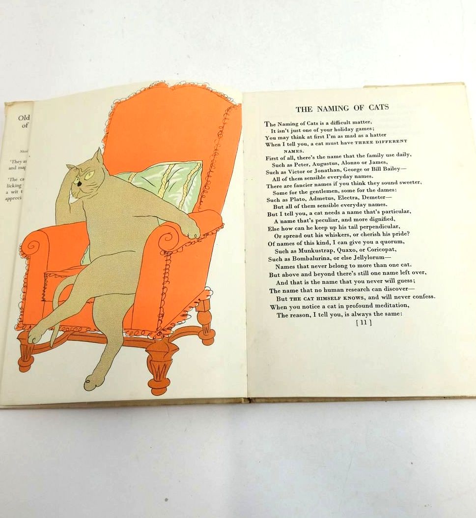 Almost very good condition in a almost very good dustwrapper. a collection of whimsical light poems by T. S. Eliot about feline psychology and sociology. Cream cloth with red title to spine and picture of two cats dancing to front cover. Colour illustrations, 50 pages.
