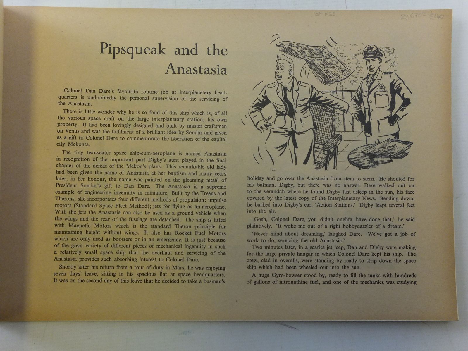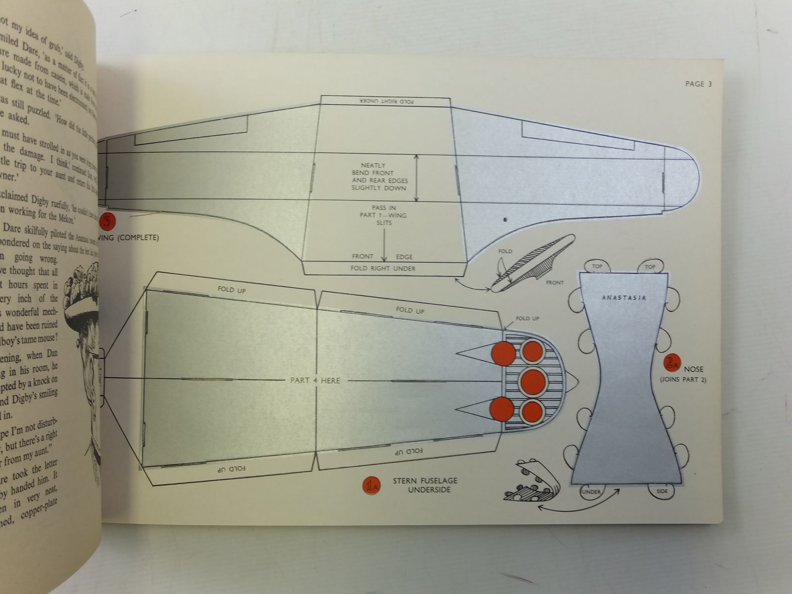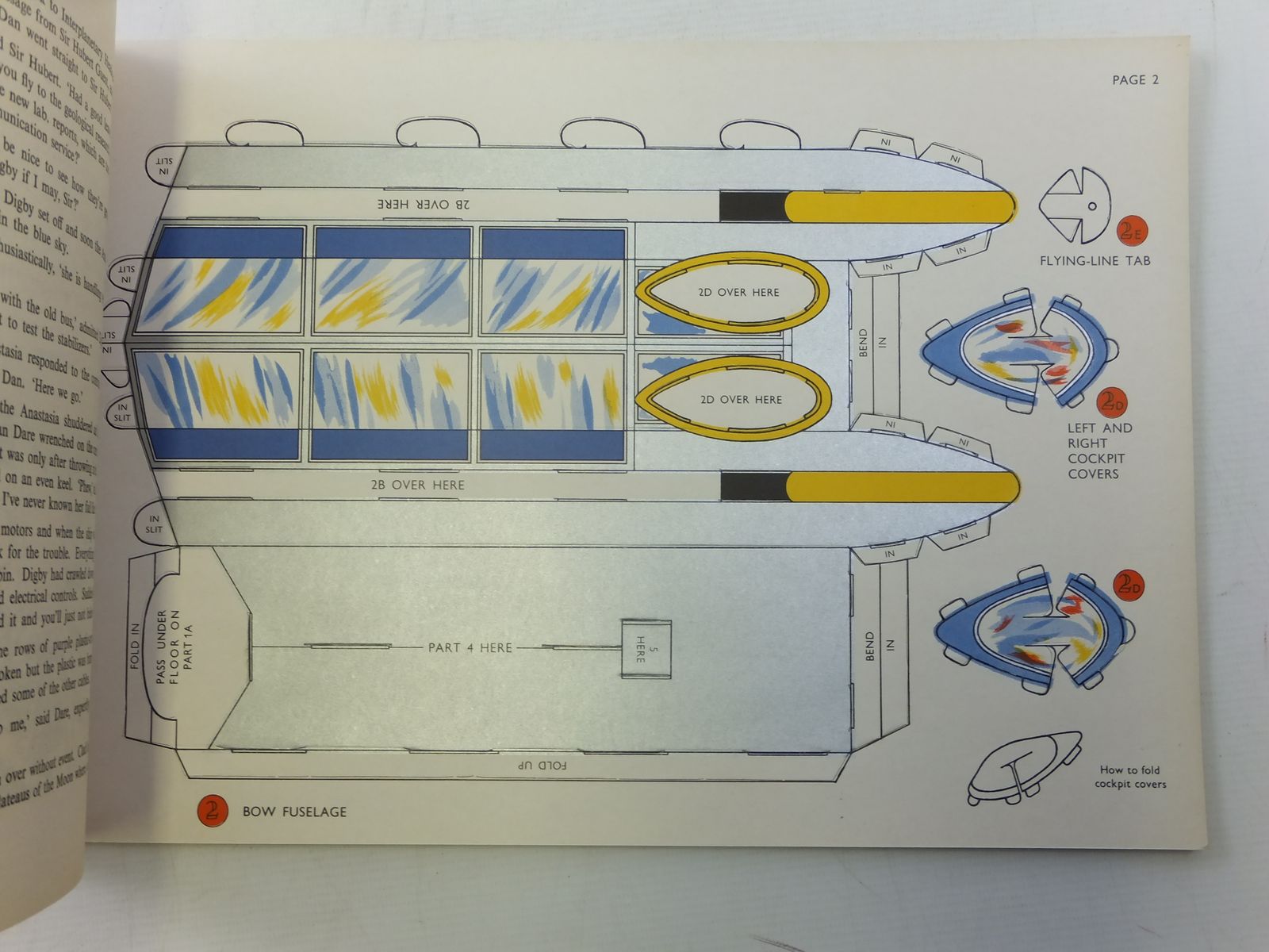 Slightly better than very good condition. A press-out book to make your own 18.25" model, by permission of Eagle. Large oblong format (10 x 15"). Cardwraps, red spine and front cover. 8 pages of text with b/w illustrations featuring the story of one of Dan Dare's adventures in Anastasia. 4 card pages with colour press-out pieces.