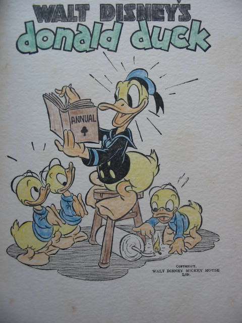 Very good condition. Pictorial boards and spine. Front cover shows Donald carrying a horseshoe and boxing gloves. Colour frontis. B/w illustrations. The first Donald Duck annual.