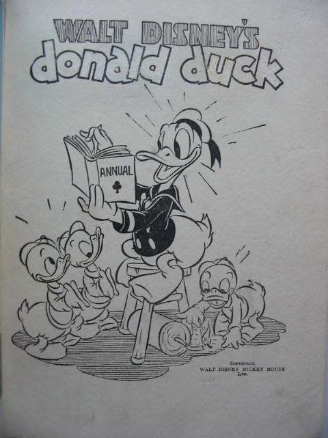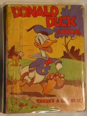 Good condition. Pictorial boards and spine. Front cover shows Donald carrying a horseshoe and boxing gloves. Colour frontis. B/w illustrations. The first Donald Duck annual.
