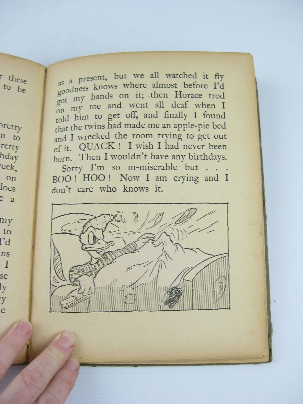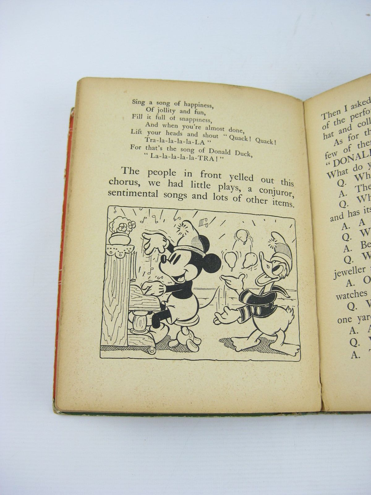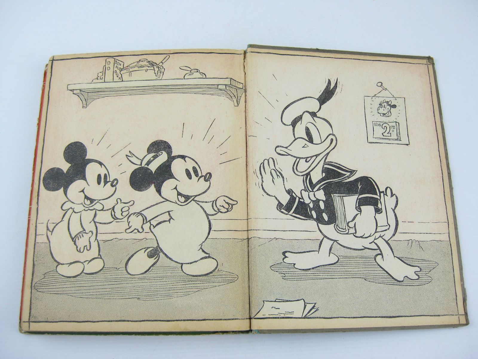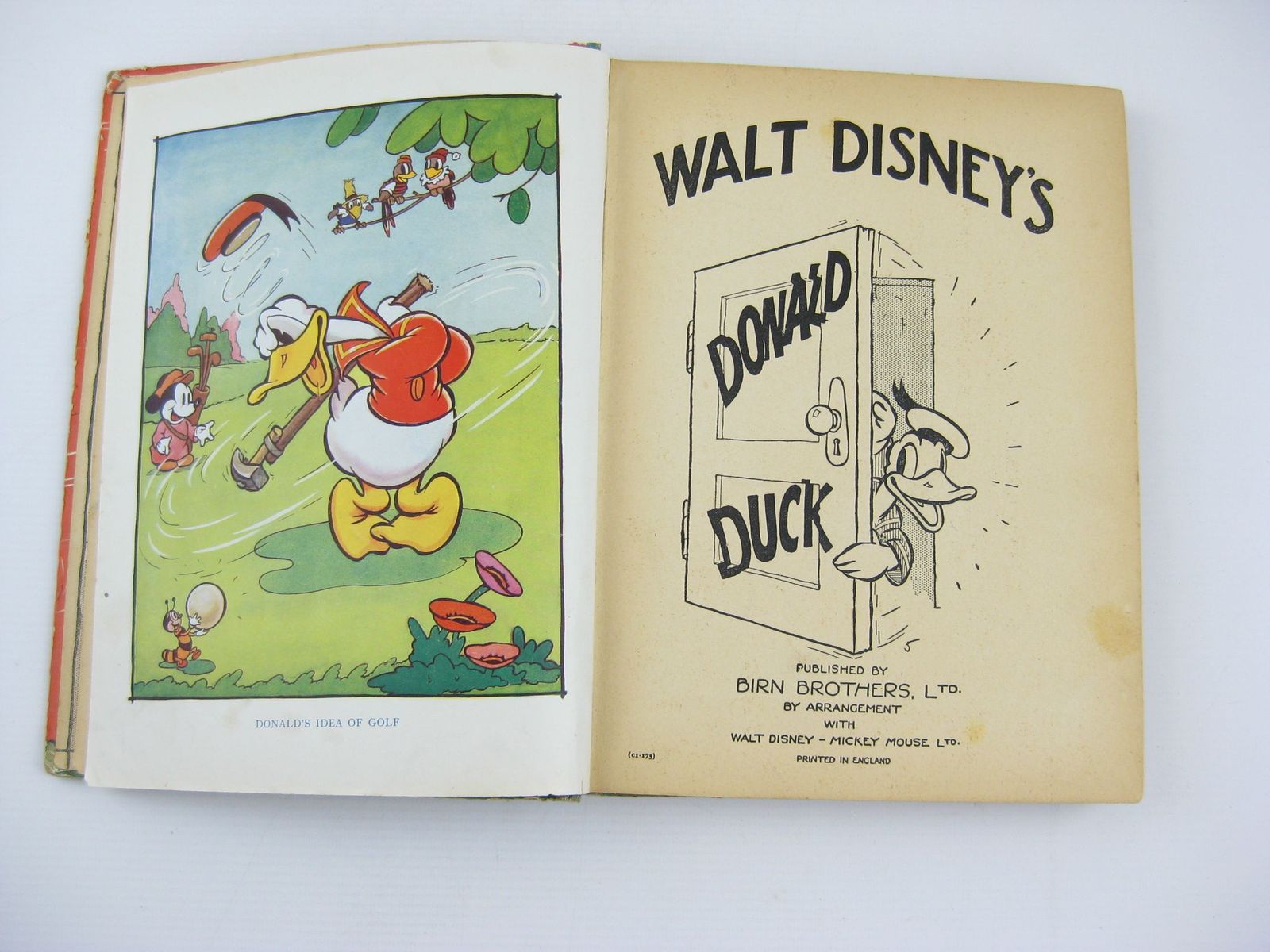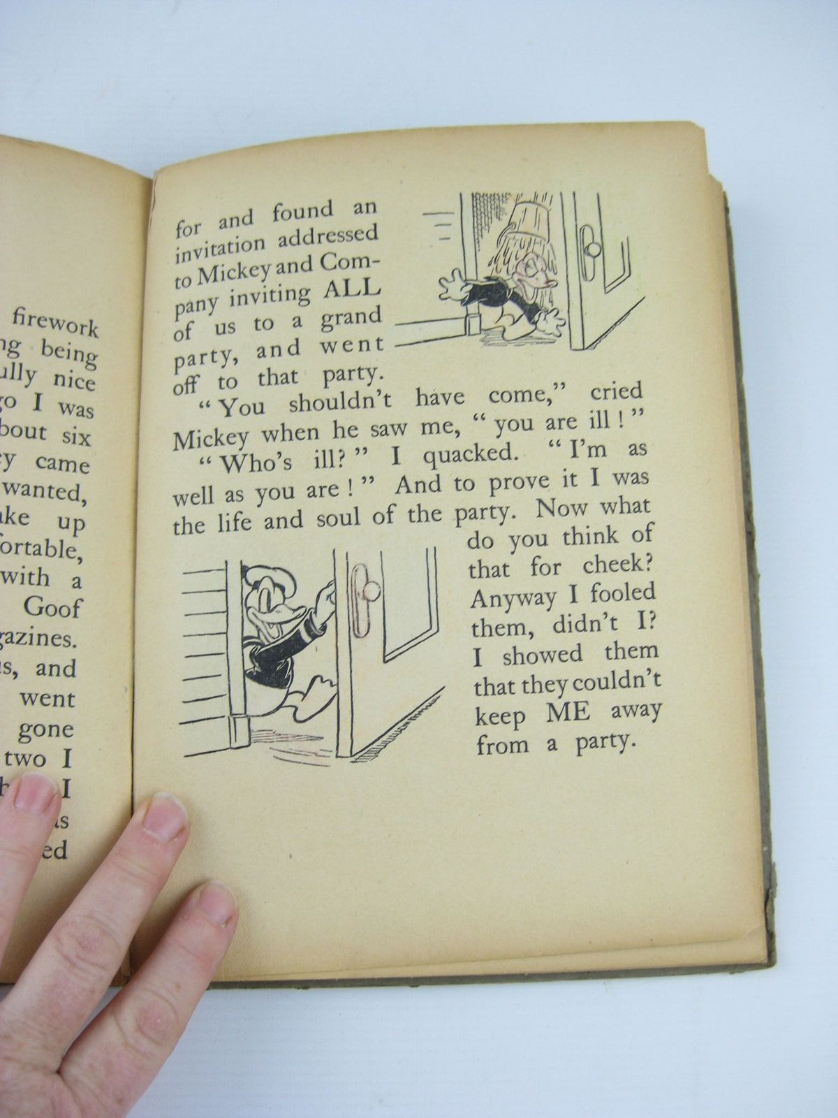 Boards edge-worn, rear board slightly marked. Front board still bright. Small mark to front endpaper. Name in belongs to box. Pages a little browned with a few light marks. Light colouring to a few illustrations. A nice copy of an early Donald Duck book.
